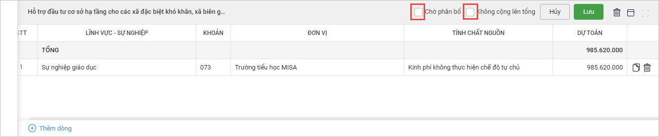 - Tích chọn Chờ phân bổ nếu muốn đánh dấu lĩnh vực này ở trạng thái chờ phân bổ trên báo cáo phân bổ dự toán khi gửi lên cấp trên.