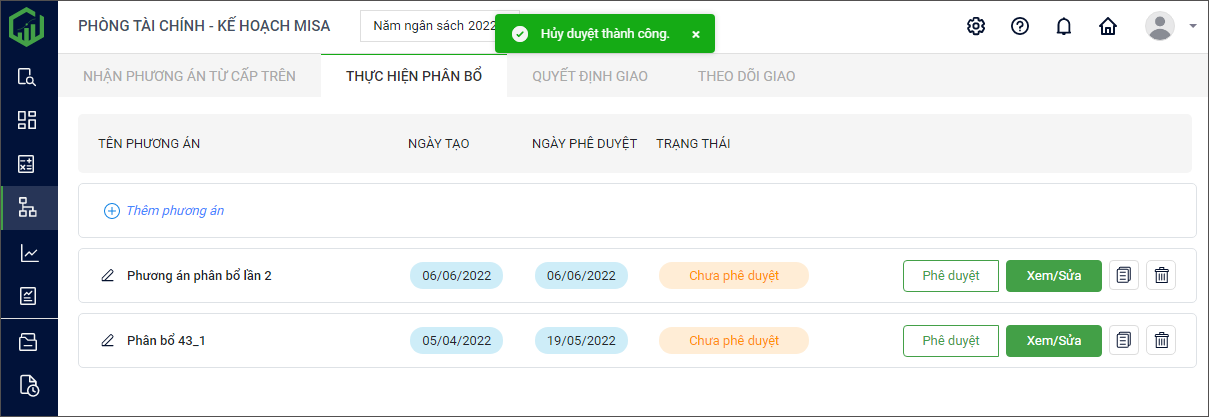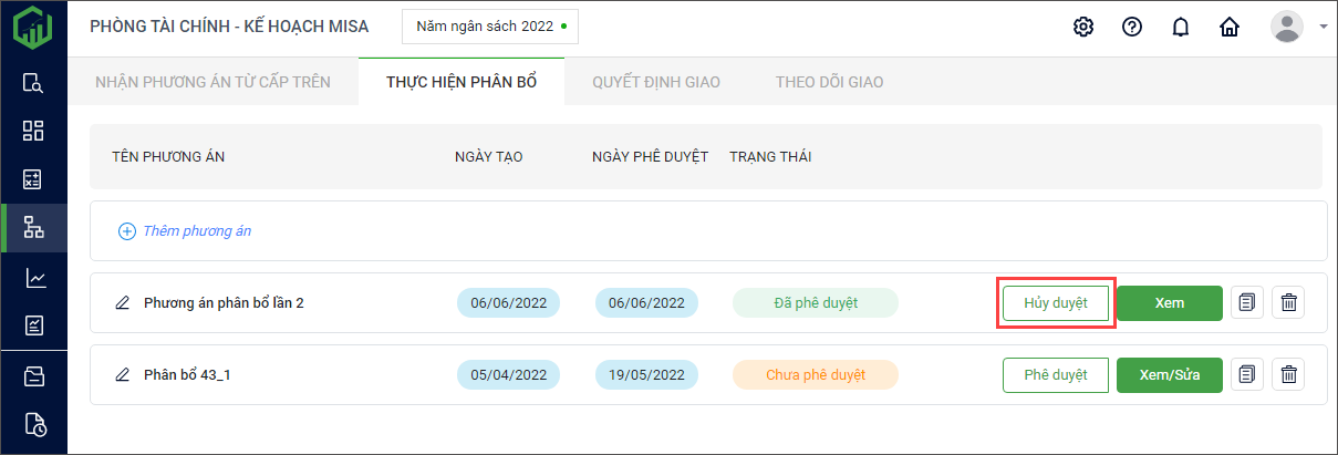 4. Trường hợp muốn phê duyệt cho 1 phương án phân bổ khác thì phải thực hiện hủy duyệt phương án phân bổ đó bằng cách nhấn Hủy duyệt.