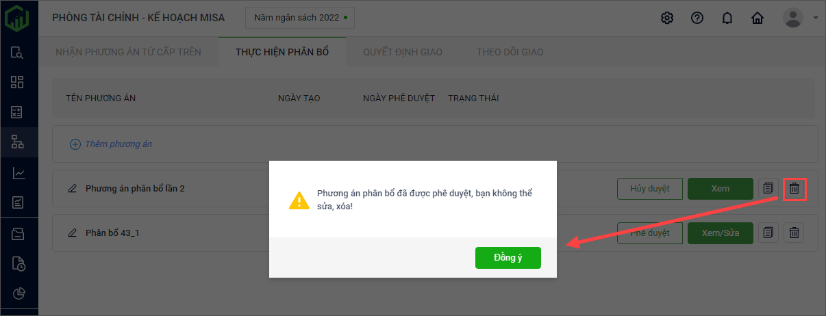 3. Trường hợp phương án phân bổ đã được phê duyệt và lập quyết định giao gửi cho cấp dưới thì anh/chị sẽ không thể xóa được. Nếu muốn xóa, anh/chị phải Thu hồi quyết định giao và Hủy duyệt phương án phân bổ.