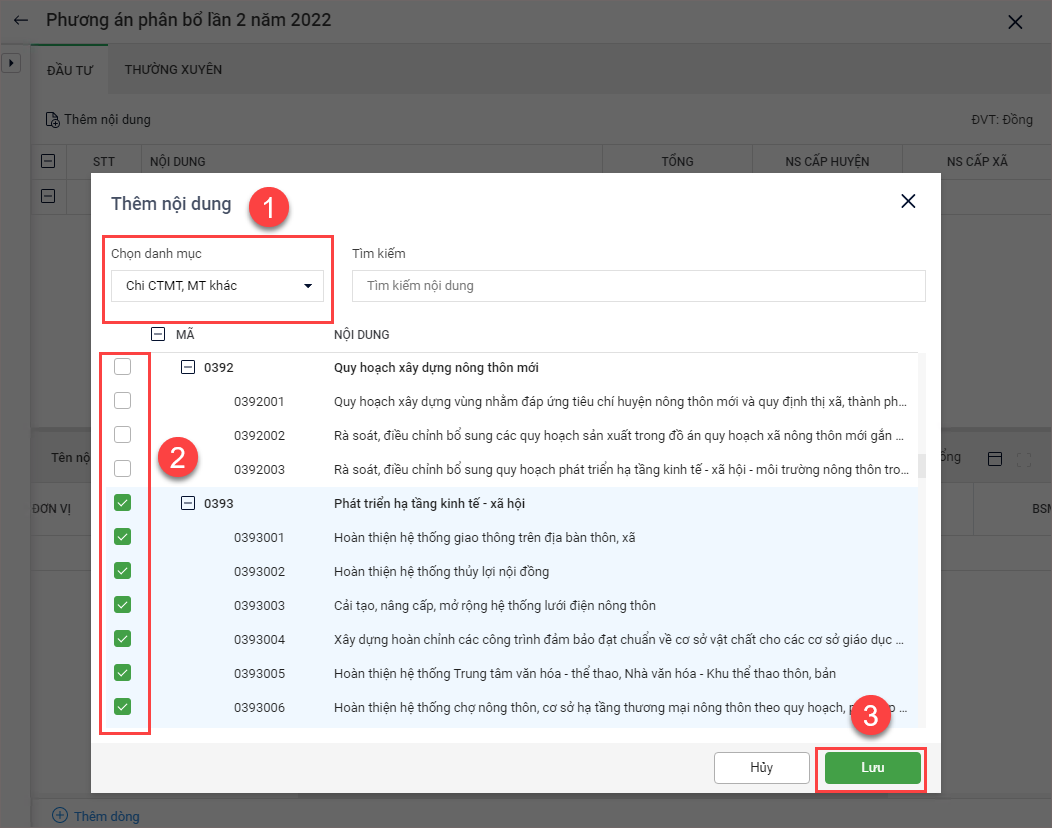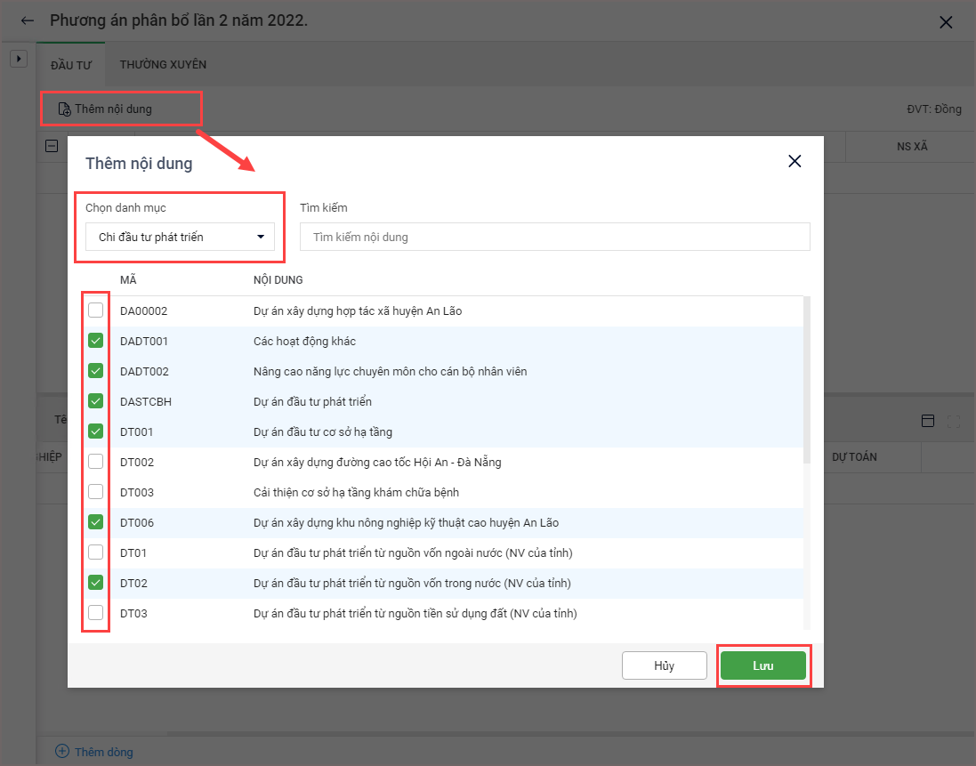- Tích chọn vào nội dung cần thực hiện phân bổ. Nhấn Lưu.