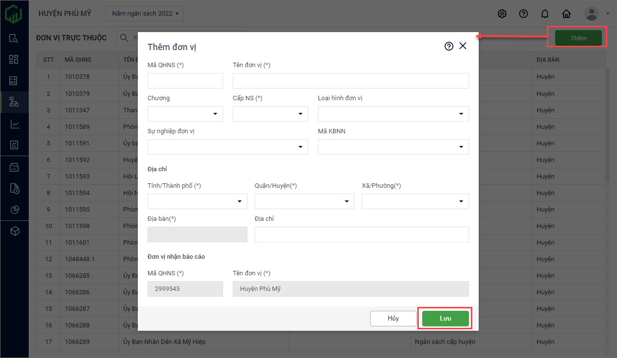 - Nhập và chọn các nội dung trong bảng thêm đơn vị, nhấn Lưu.