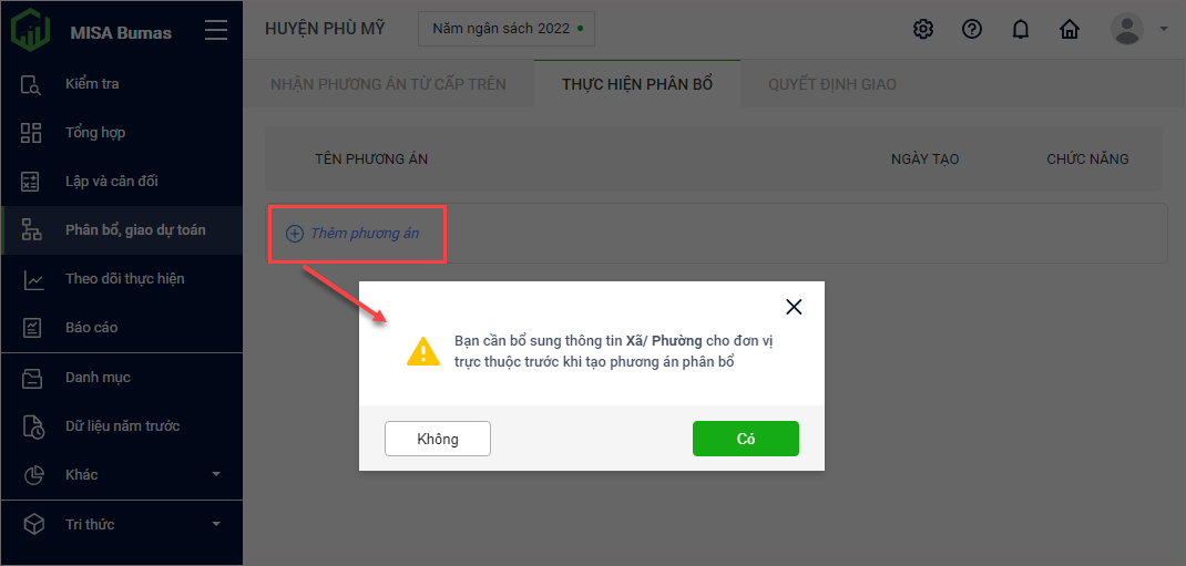 Lưu ý: Nếu đơn vị chưa thiết lập trường thông tin các đơn vị cấp dưới, thì khi thêm phương án phân bổ phần mềm sẽ hiển thị thông báo như sau: