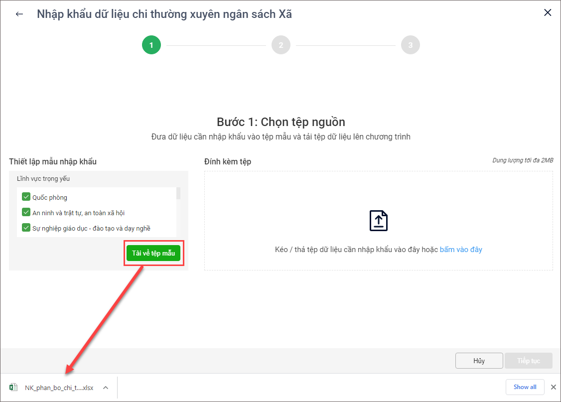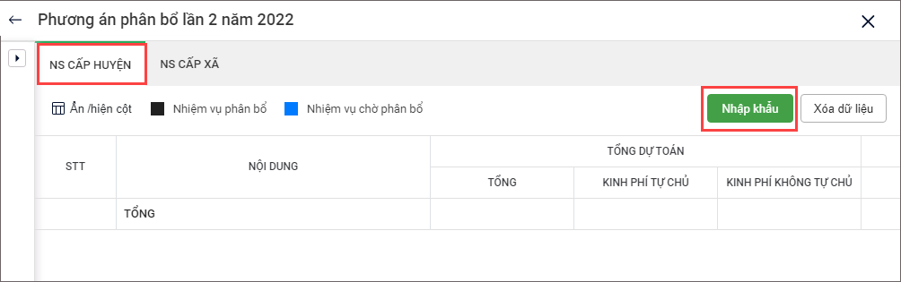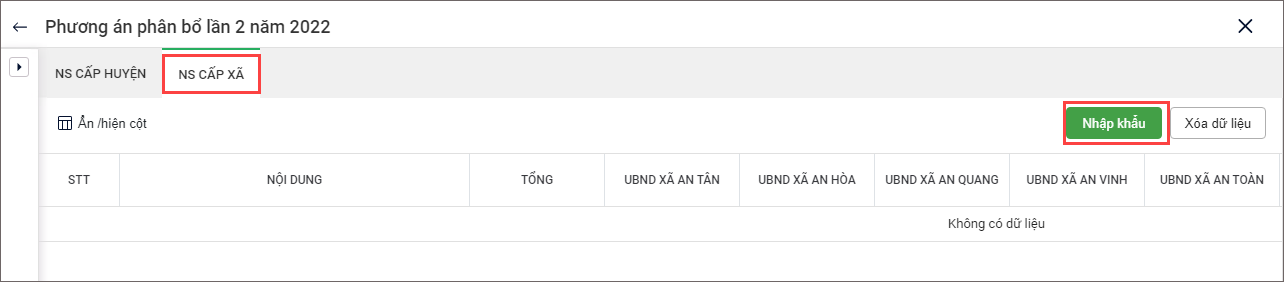 - Chọn tab NS cấp Xã, nhấn Nhập khẩu để nhập khẩu dữ liệu.