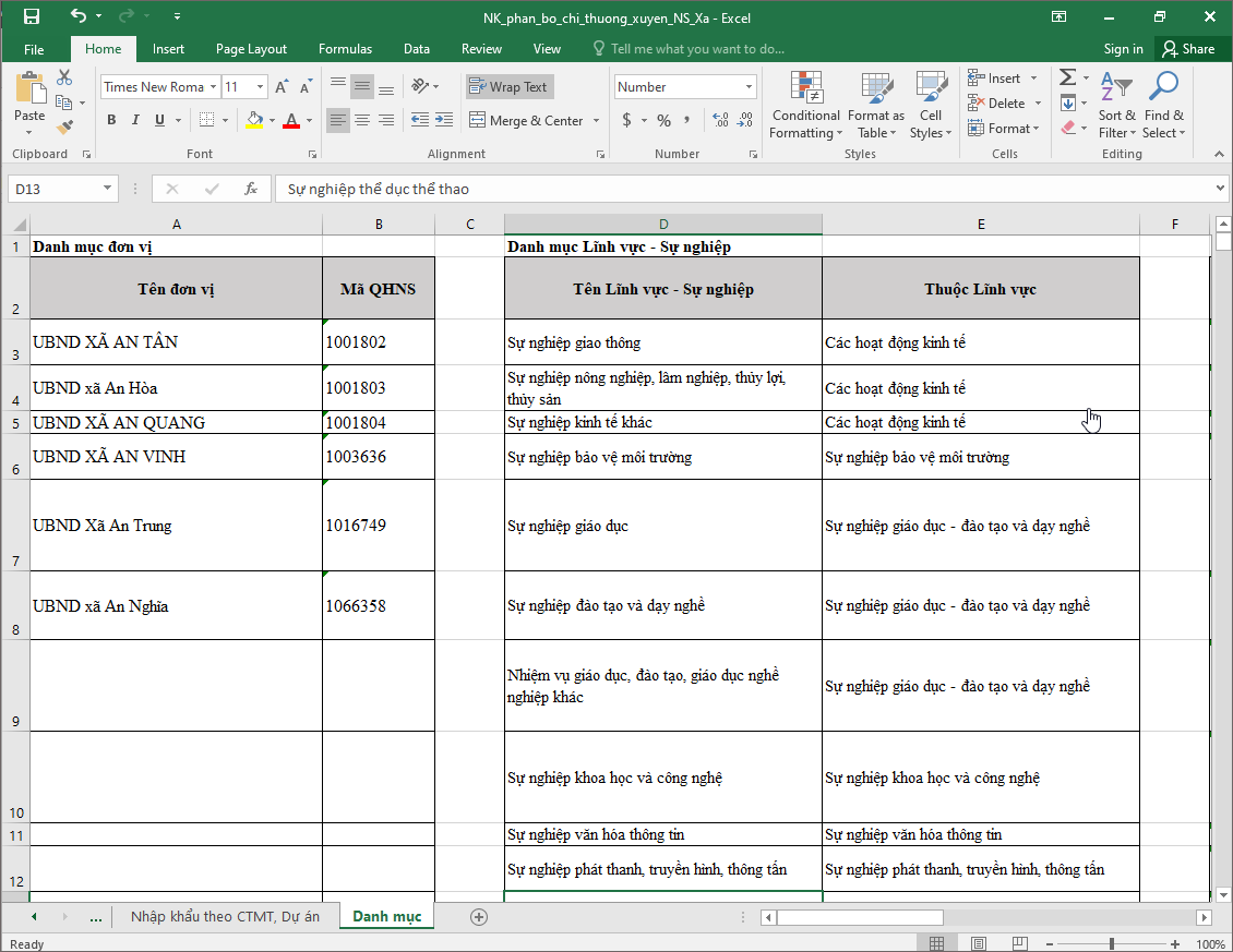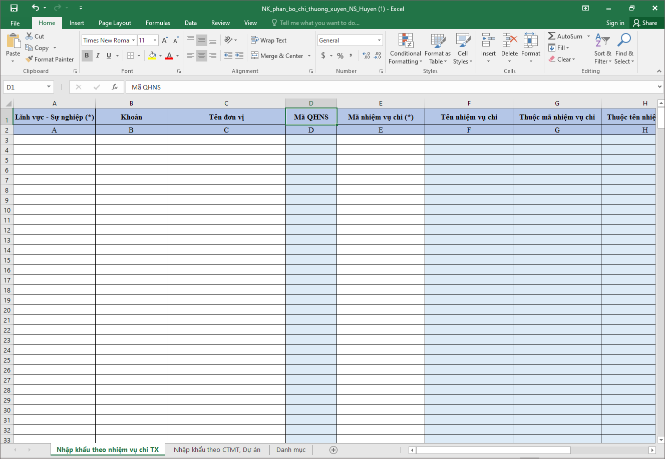 2. Mở tệp đã tải và nhập liệu cho các nội dung chỉ tiêu phân bổ dự toán.