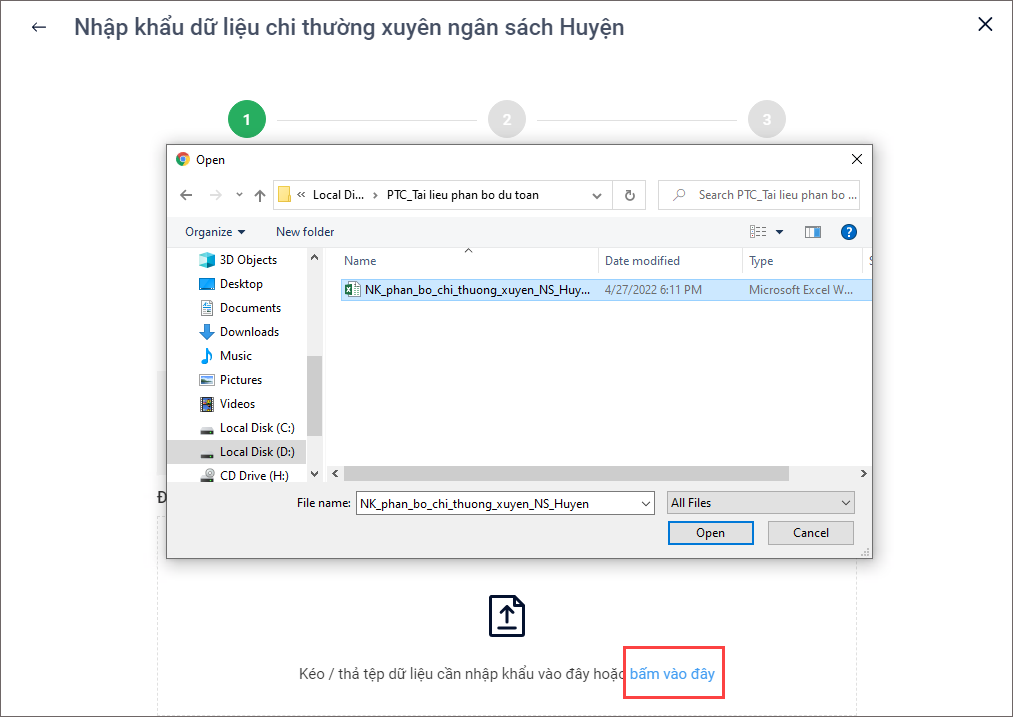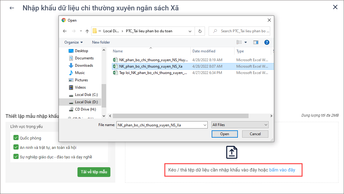 4. Kéo/thả tệp dữ liệu vào phần mềm hoặc nhấn Bấm vào đây để tải file đã nhập liệu lên chương trình.