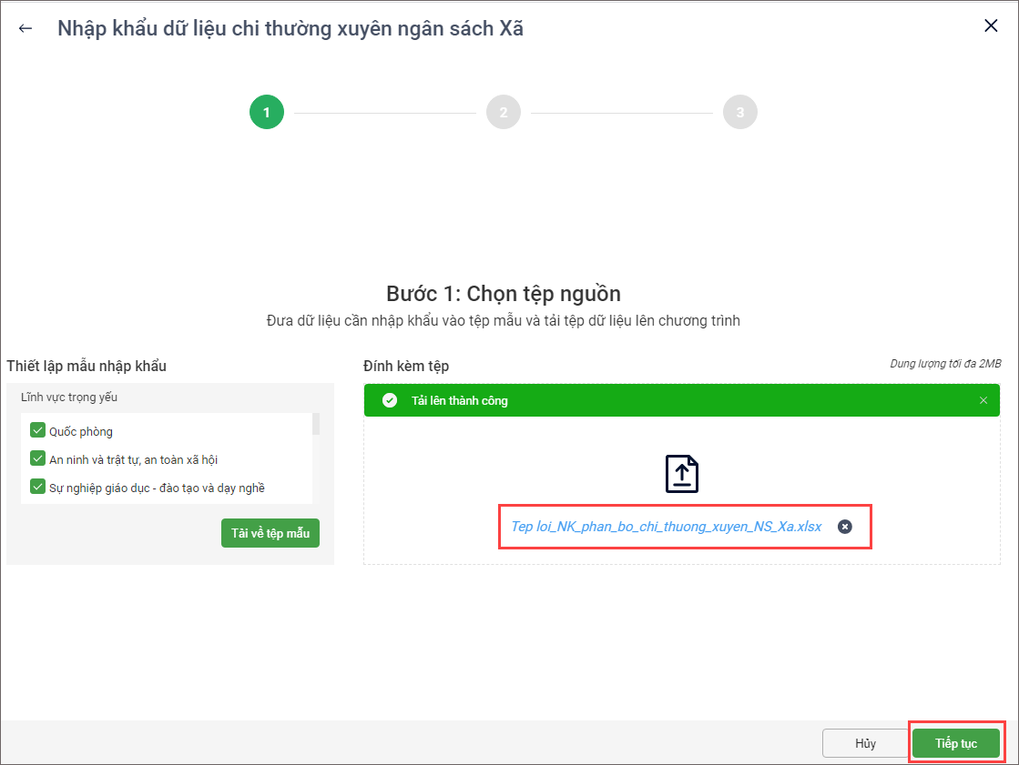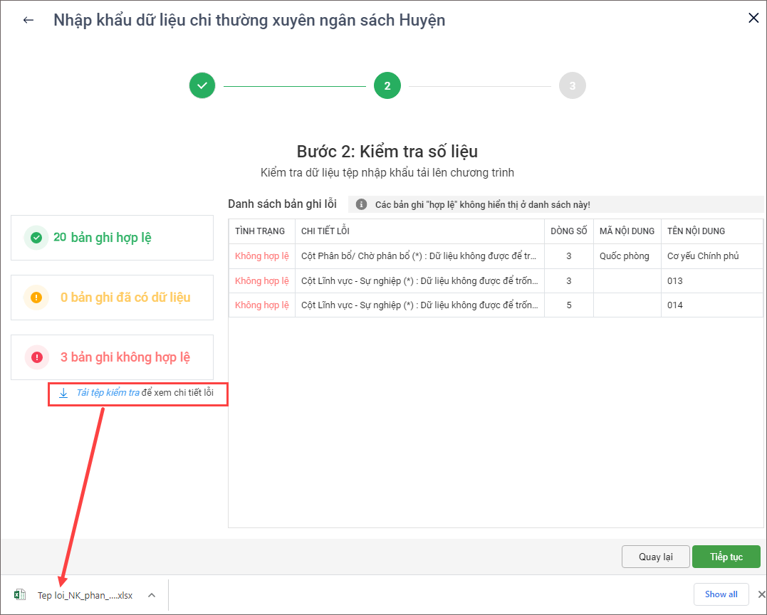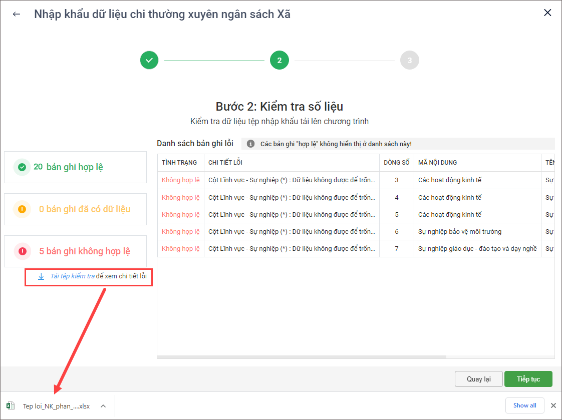 - Nếu kiểm tra thấy không còn bản ghi nào báo lỗi. Nhấn Tiếp tục.