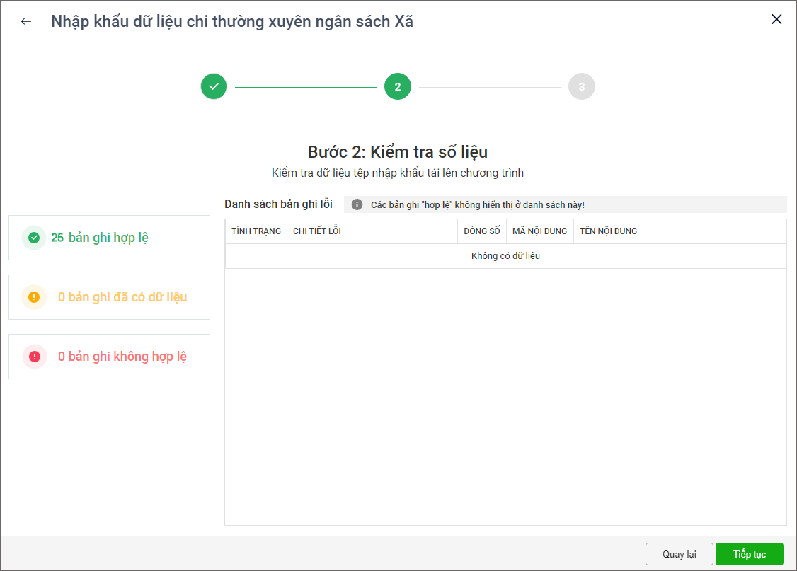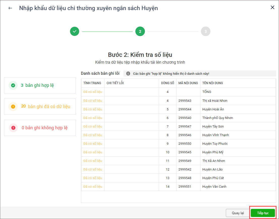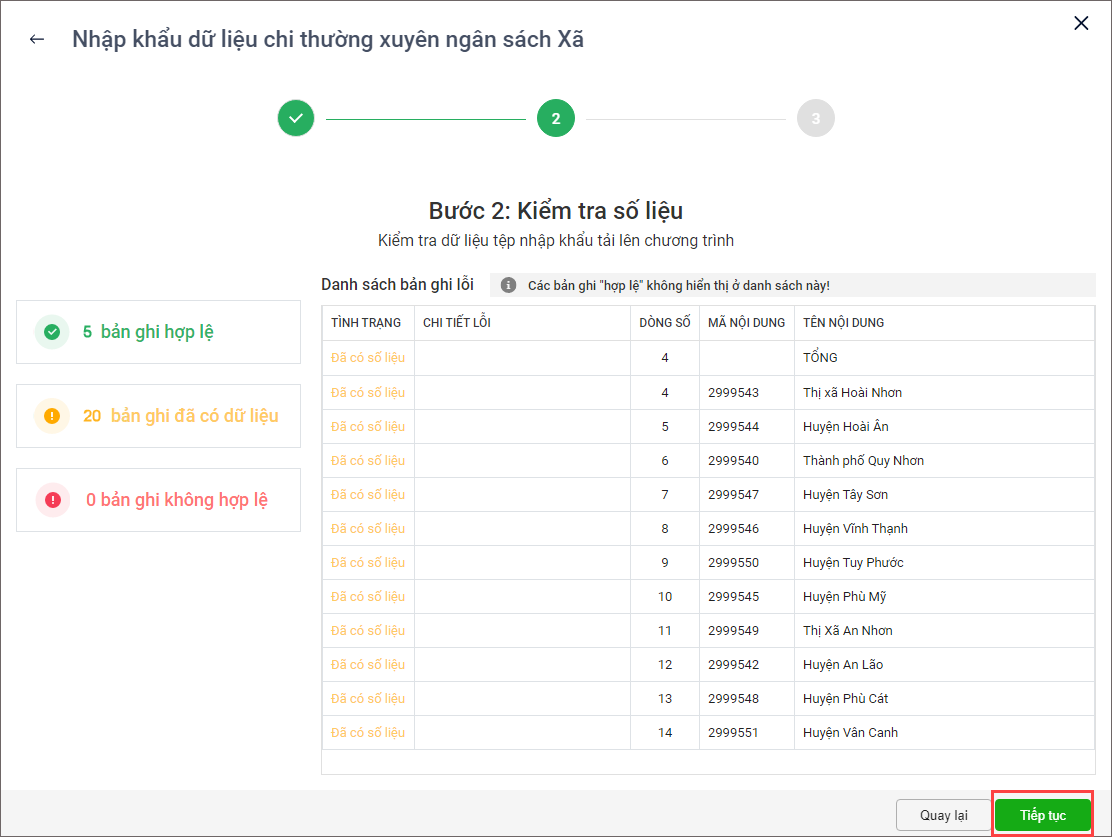 1. Trường hợp tất cả các bản ghi đều hợp lệ, nhấn Tiếp tục để hoàn thành kiểm tra số liệu.