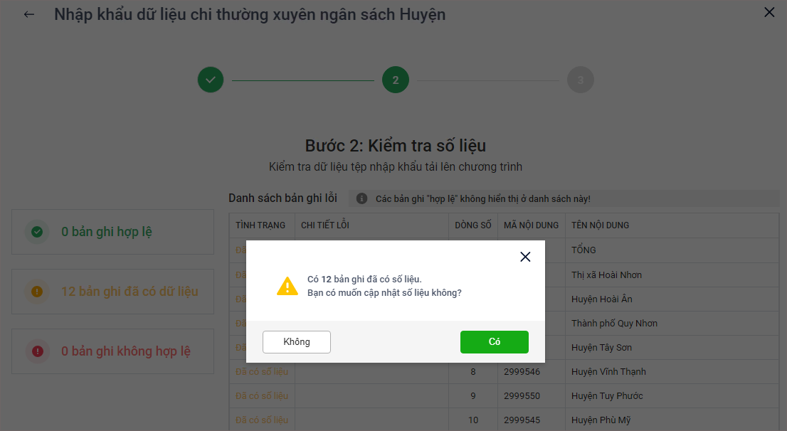- Nếu nội dung chi thường xuyên đã có dữ liệu, đơn vị muốn ghi đè lên số liệu đã có thì nhấn Có.
