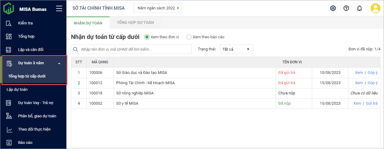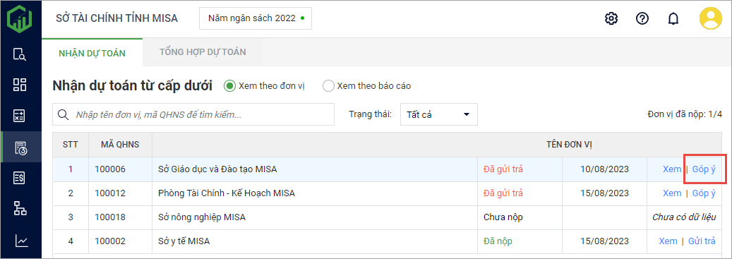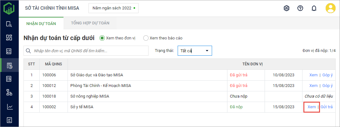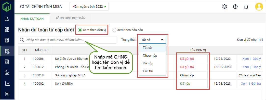 - Lọc nhanh trạng thái nộp dự toán của đơn vị cấp dưới bằng cách nhấn vào bộ lọc.