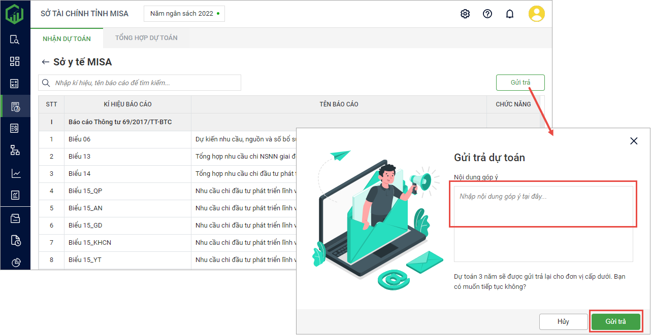 - Trạng thái Đã gửi trả: Đơn vị cấp trên đã kiểm tra dự toán của đơn vị cấp dưới và gửi phản hồi dự toán.