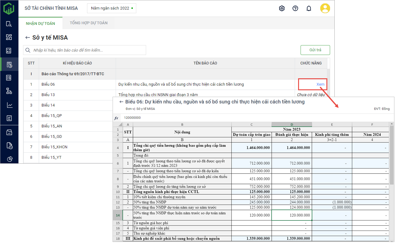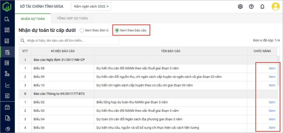 1. Tại tab Nhận dự toán, chọn Xem theo báo cáo.