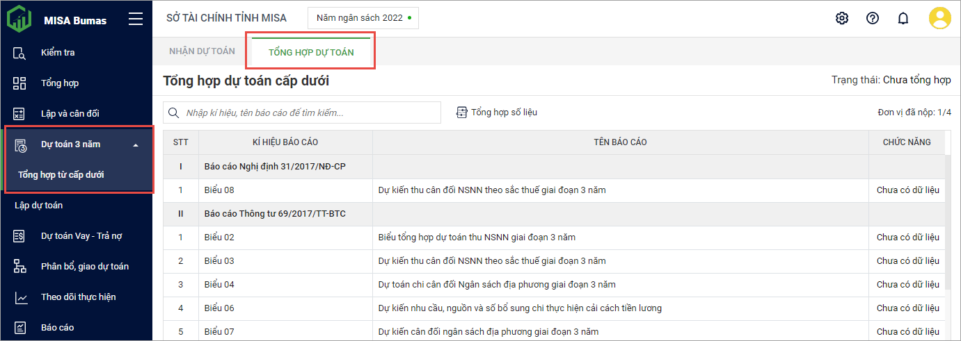 - Trạng thái Chưa nộp: Đơn vị cấp dưới chưa nộp dự toán ba năm.