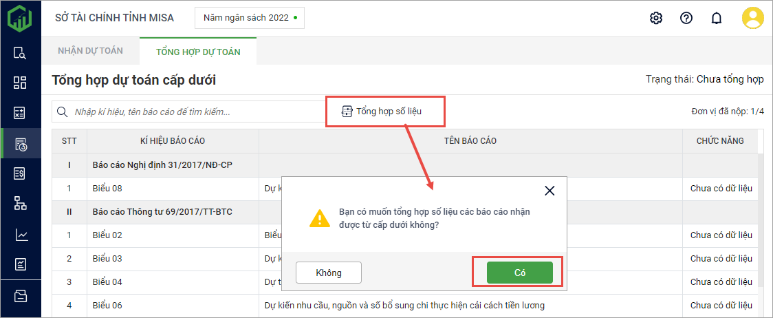 - Nhấn Có nếu chắc chắn muốn cập nhật số liệu mới nhất từ các đơn vị đã nộp báo cáo.
