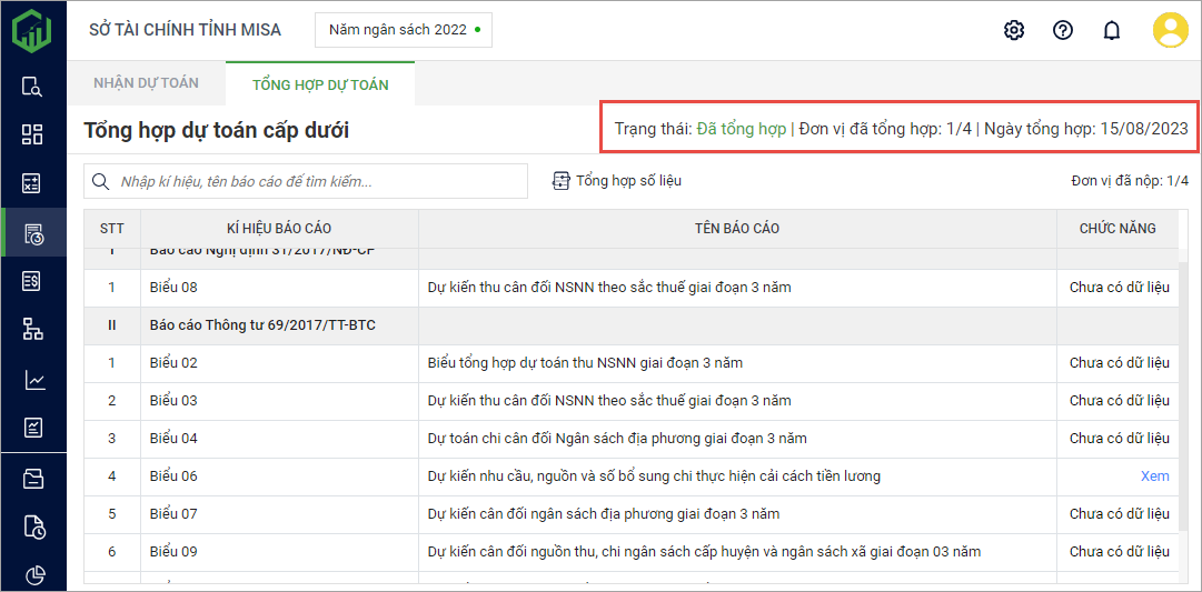 3. Nhấn Tổng hợp số liệu => Phần mềm sẽ tự động tổng hợp số liệu tất cả báo cáo đơn vị có trạng thái Đã nộp ở thời điểm hiện tại.