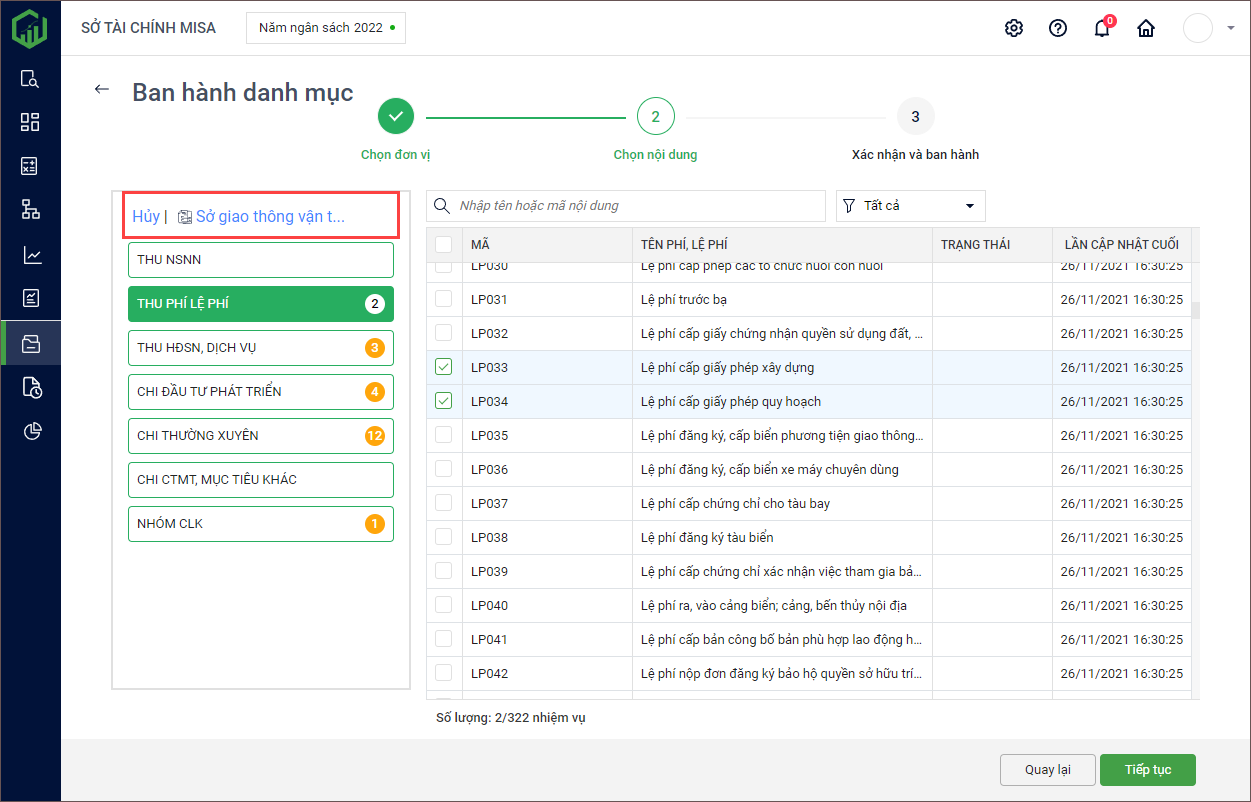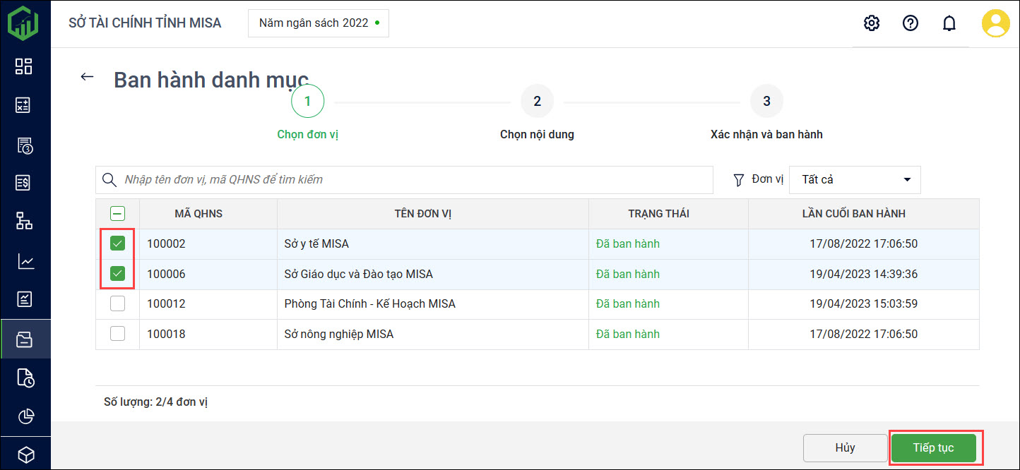- Tích chọn các đơn vị cần ban hành danh mục thu – chi.