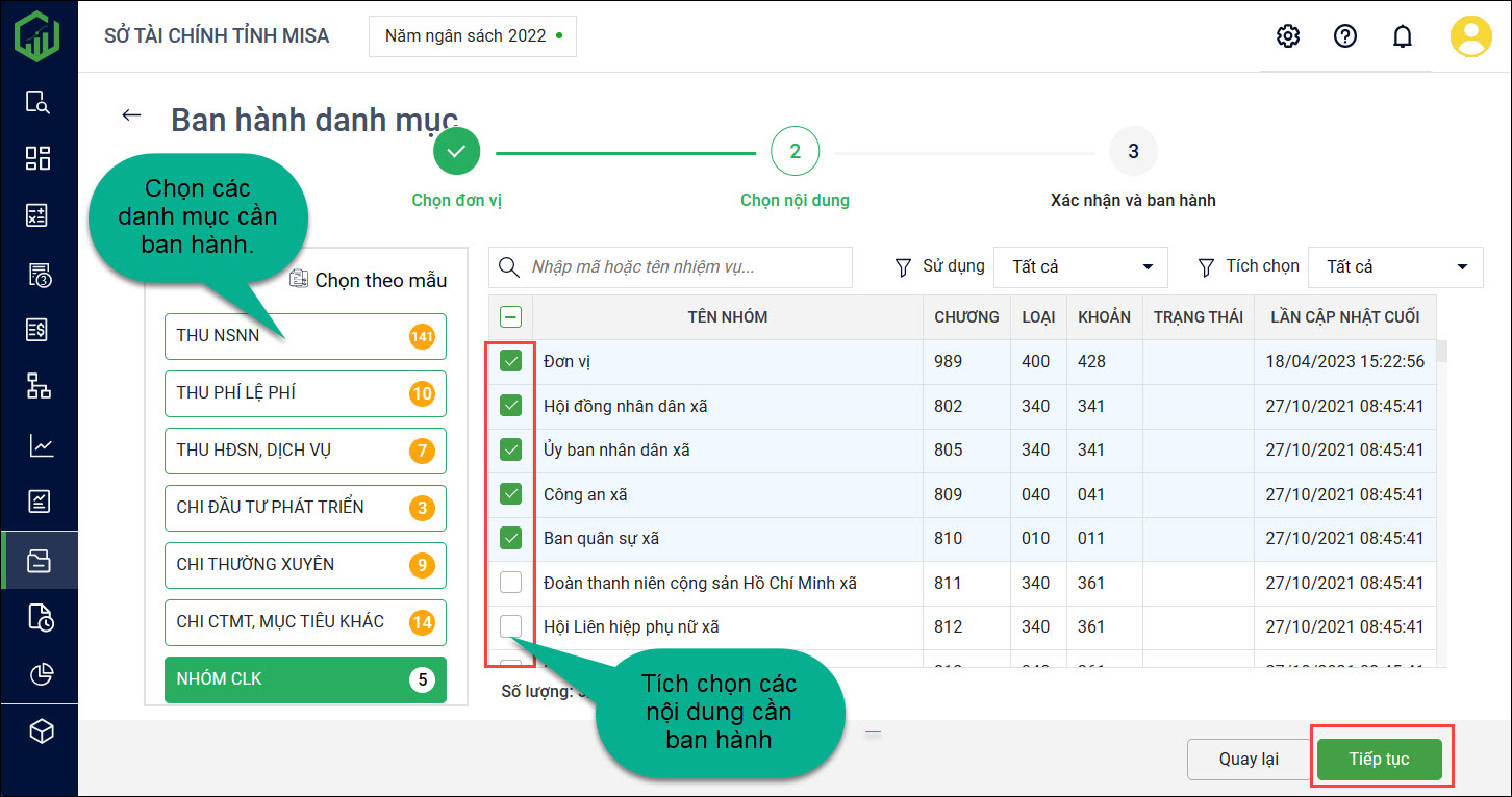 - Chọn Danh mục thu – chi, tích chọn các nội dung cần ban hành cho cấp dưới.