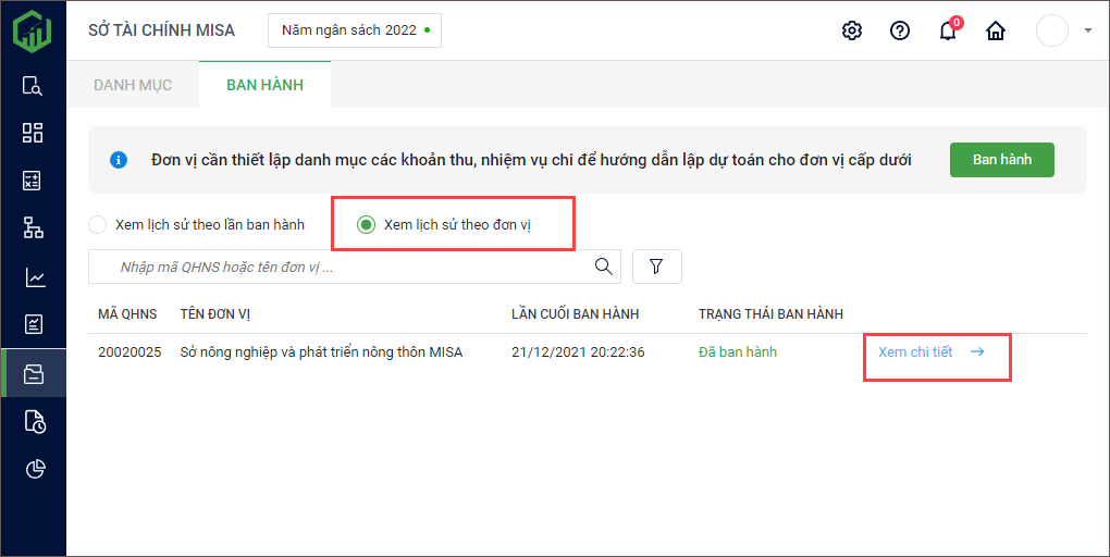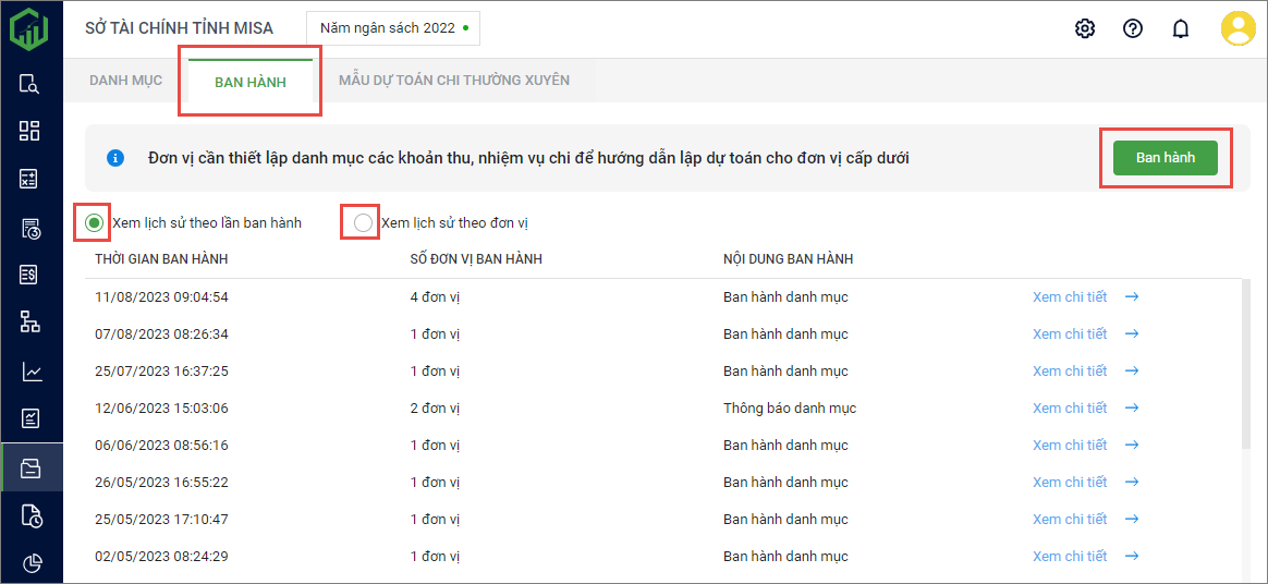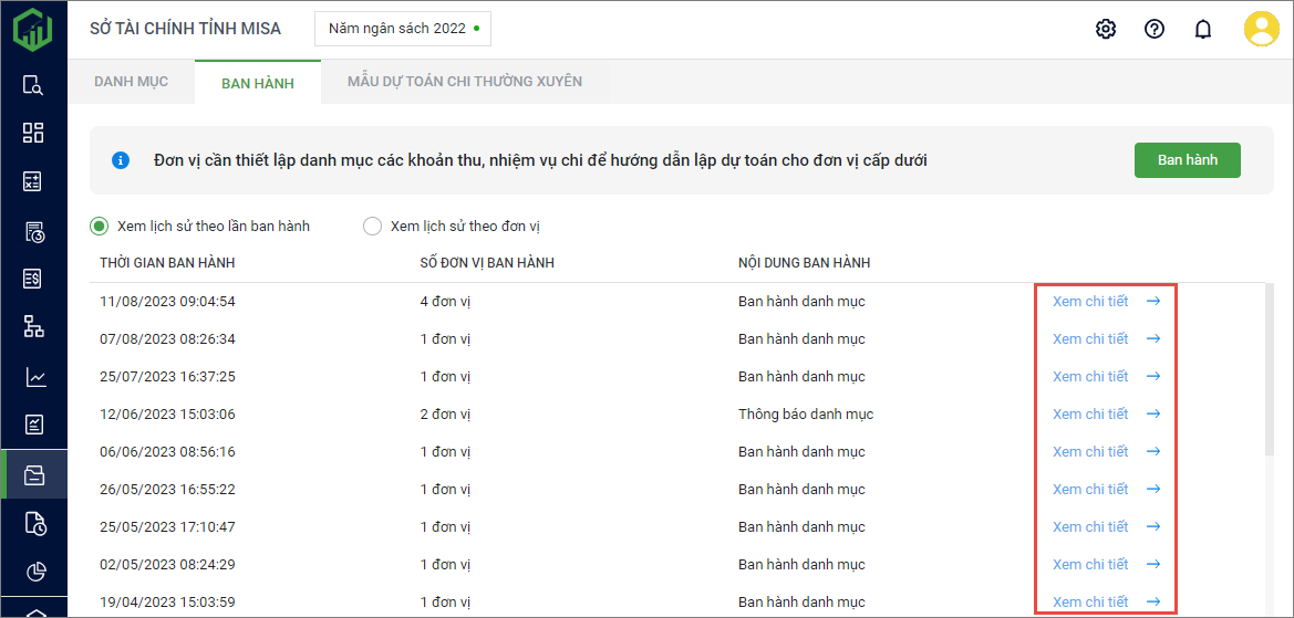 Sau khi ban hành danh mục thu – chi cho cấp dưới, Sở tài chính có thể xem được lịch sử ban hành danh mục cho đơn vị cấp dưới theo lần ban hành hoặc xem theo đơn vị.