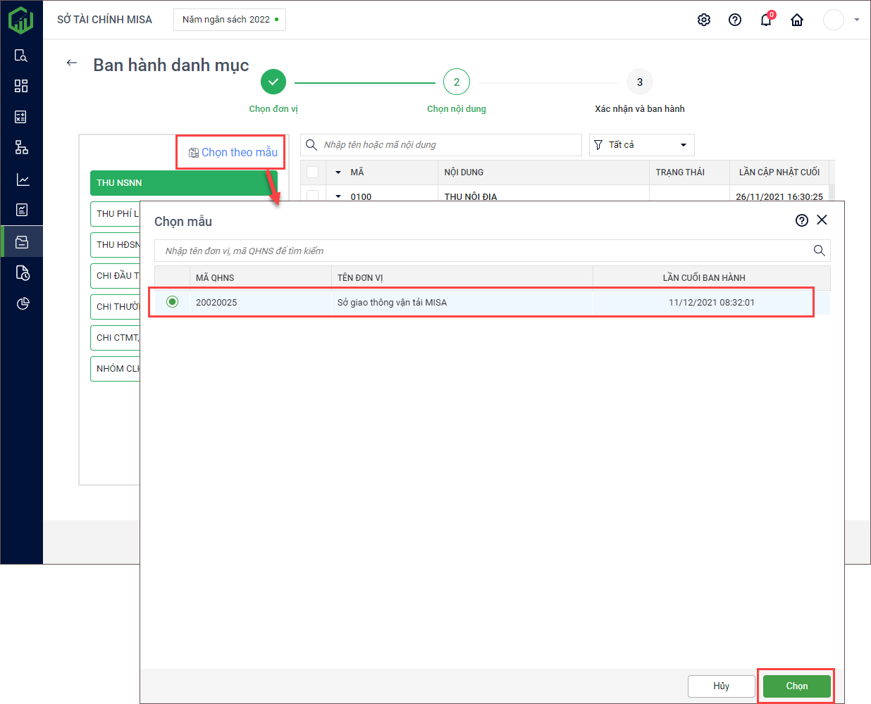 - Khi chọn theo mẫu, Sở tài chính chọn ban hành theo mẫu của đơn vị nào => Phần mềm sẽ lấy toàn bộ các nội dung danh mục của đơn vị đó sang đơn vị được ban hành lần này.