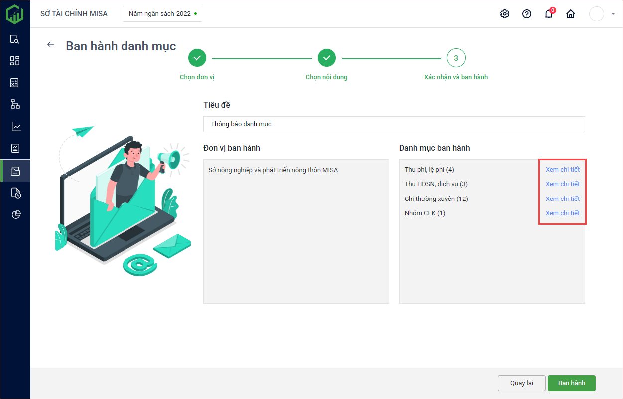 3. Nhấn Ban hành để ban hành danh mục thu – chi cho cấp dưới.