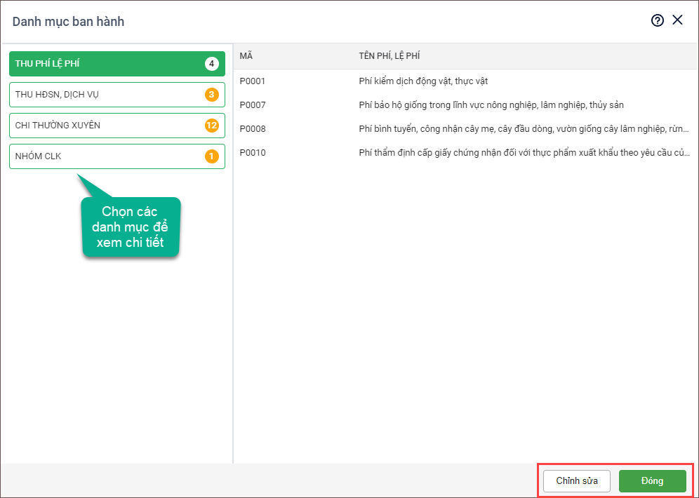 - Nhấn Ban hành để ban hành các danh mục thu – chi cho cấp dưới.