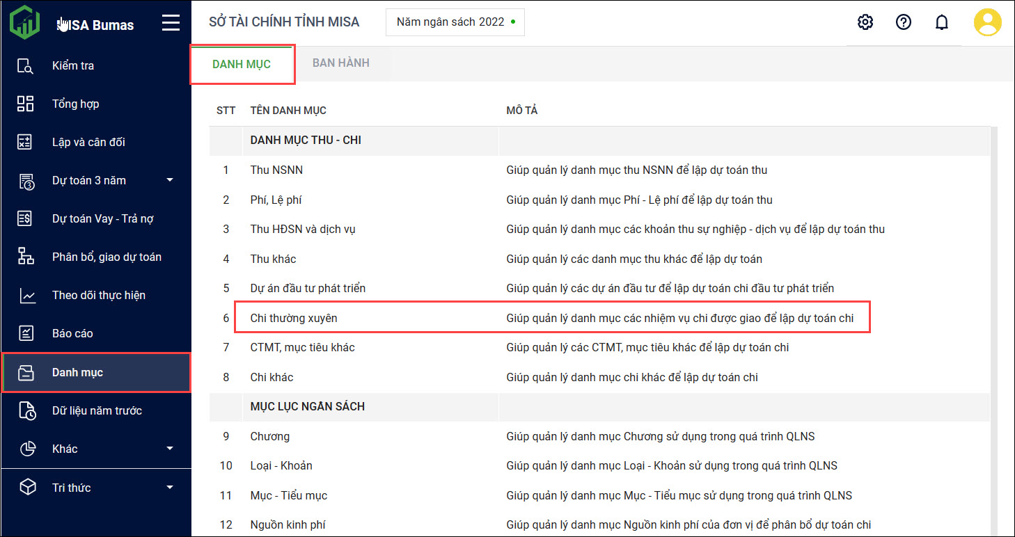 Khi đơn vị nhận danh mục Chi thường xuyên từ cấp trên, đơn vị cần kiểm tra lại danh mục trên phần mềm tại đơn vị, để kiểm tra anh/chị thao tác như sau: