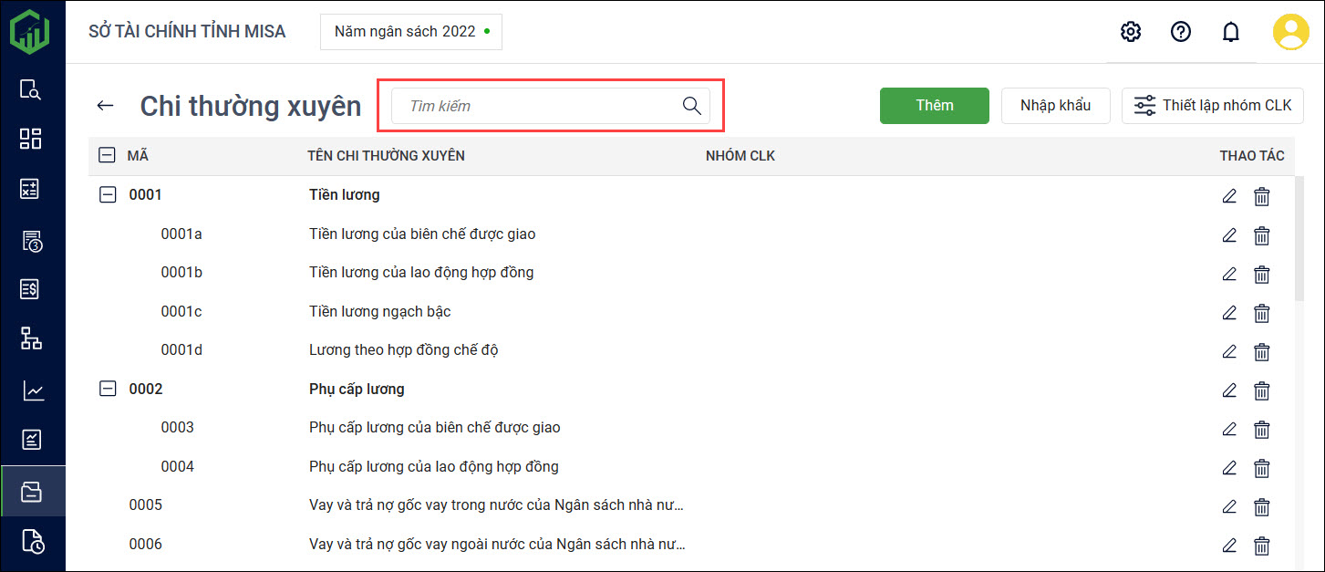 Đơn vị có thể tìm kiếm nhanh danh mục bằng cách Nhập  hoặc Tên Chi thường xuyên vào mục tìm kiếm.