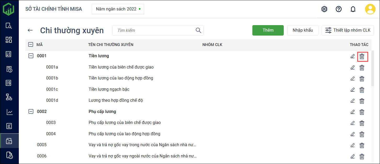 Lưu ý: Đơn vị chỉ xóa được danh mục Chi thường xuyên tự thêm mới, không xóa được danh mục cấp trên ban hành và danh mục đã phát sinh dữ liệu (tức là danh mục đã được lập dự toán).