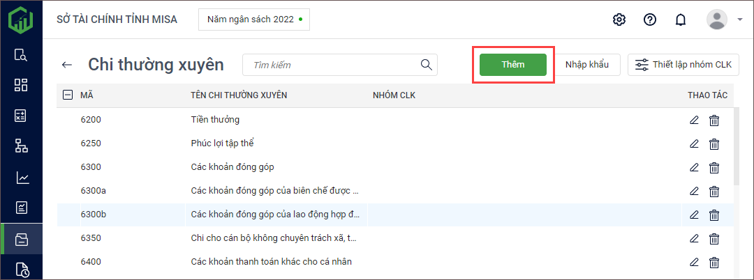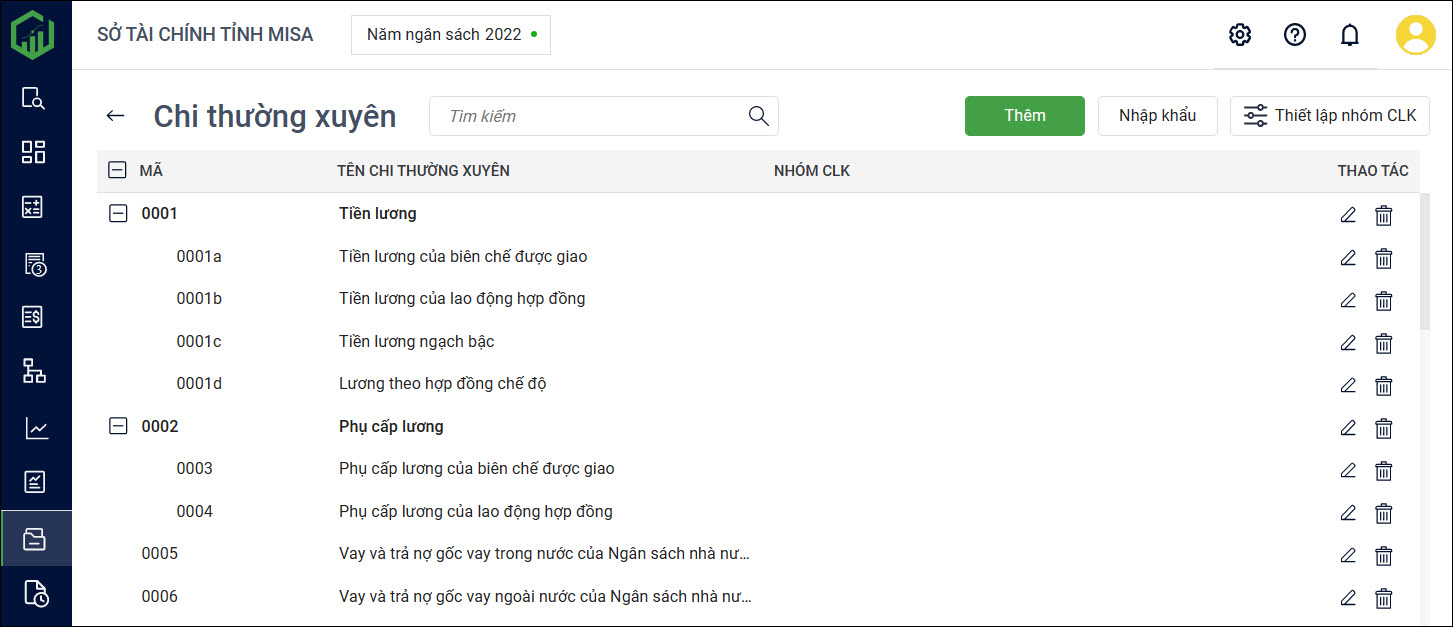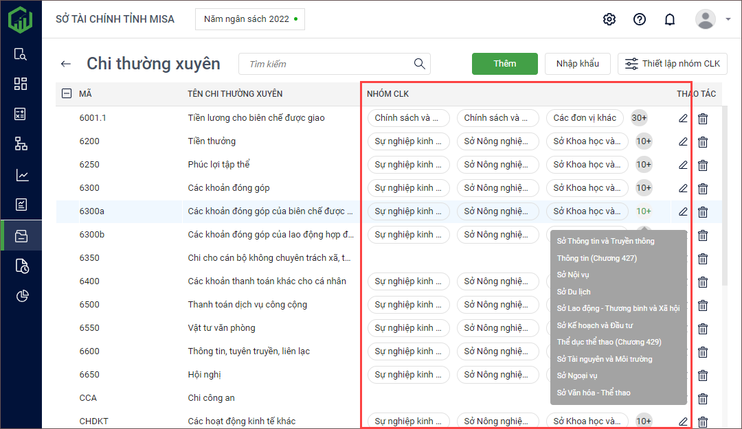 3. Tại màn hình danh mục Chi thường xuyên, các nhiệm vụ chi được thiết lập Nhóm Chương – Loại – Khoản sẽ được hiển thị tại cột Nhóm CLK.