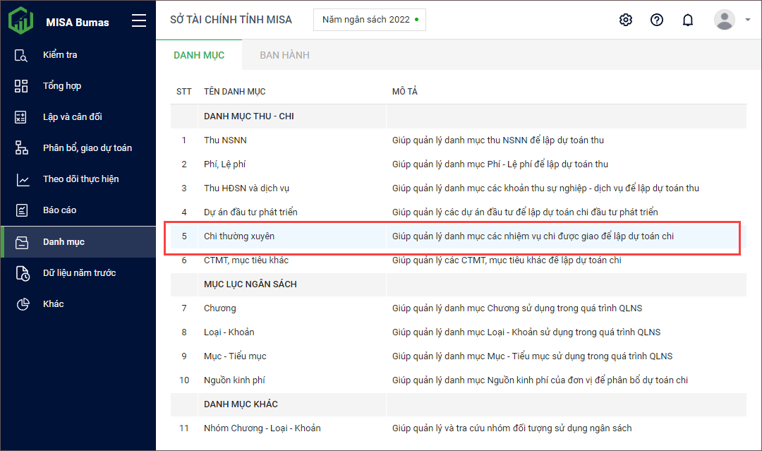Giúp đơn vị thiết lập được danh mục các khoản chi thường xuyên để ban hành cho đơn vị cấp dưới lập dự toán.