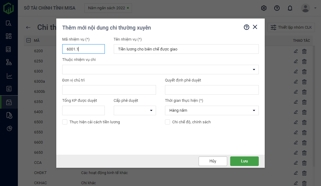 2. Khai báo các thông tin trên màn hình Thêm mới nội dung chi thường xuyên.