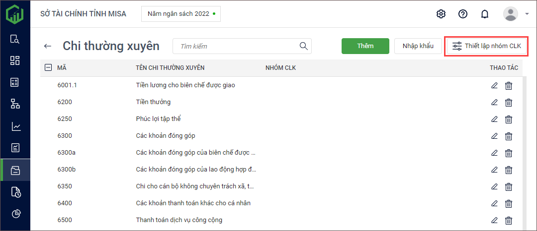 Bước 2: Thiết lập nhóm CLK (Chương – Loại – Khoản) cho nhiệm vụ chi.