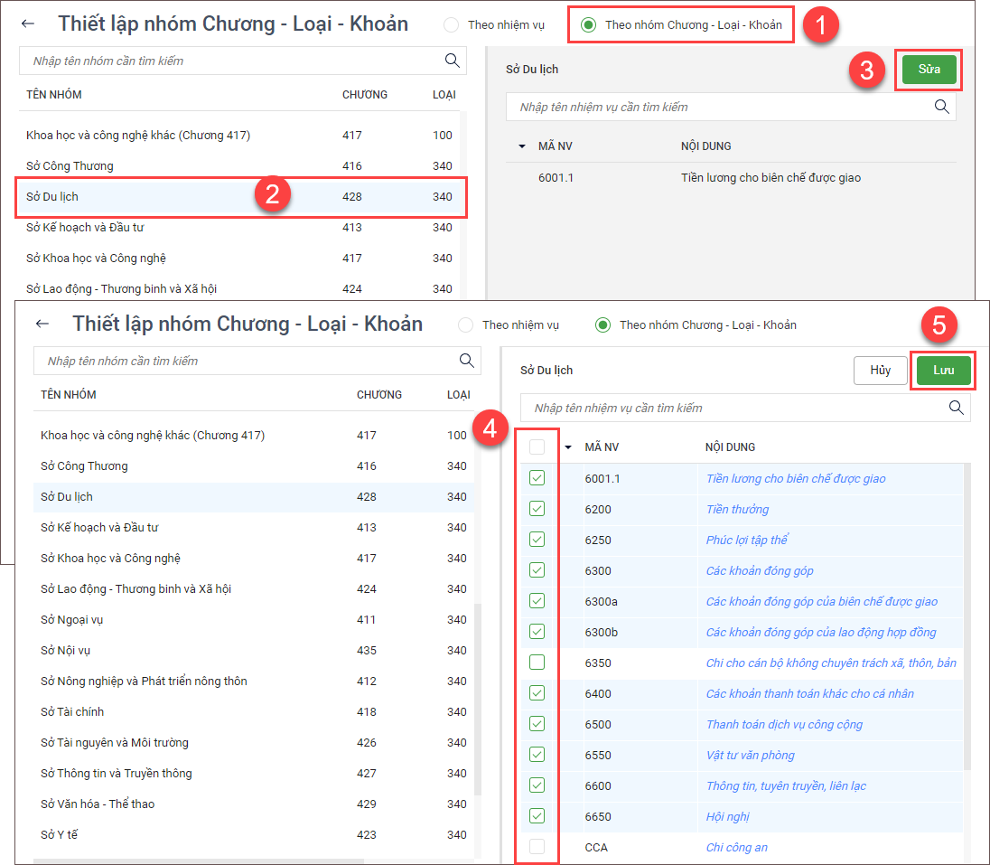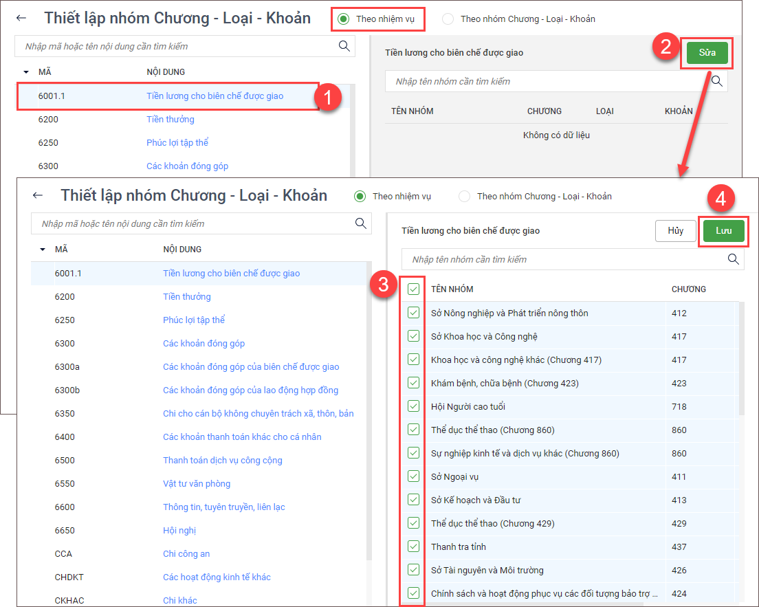 • Tích chọn các nhóm Chương – Loại – Khoản cho nhiệm vụ.