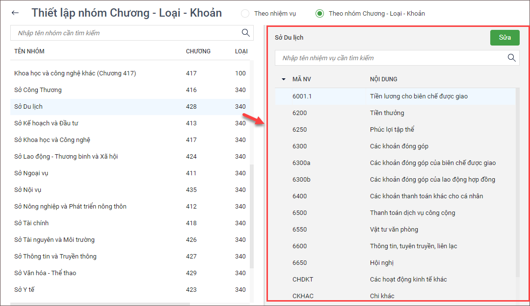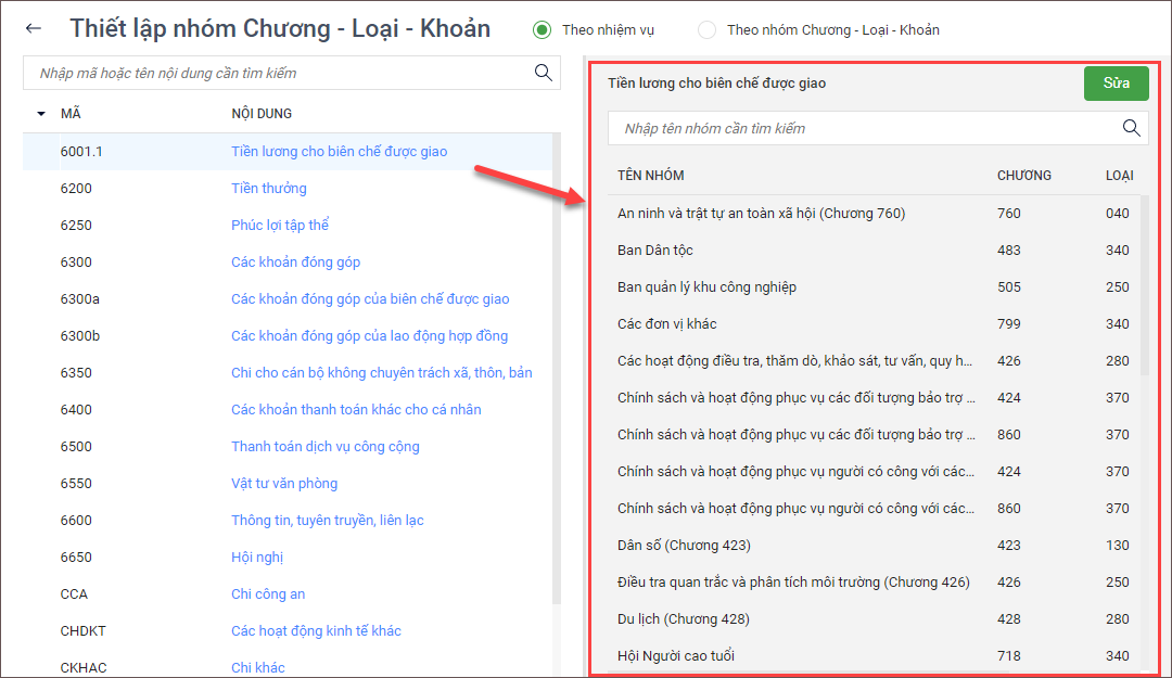 • Chọn nhóm Chương – Loại – Khoản trên danh sách.