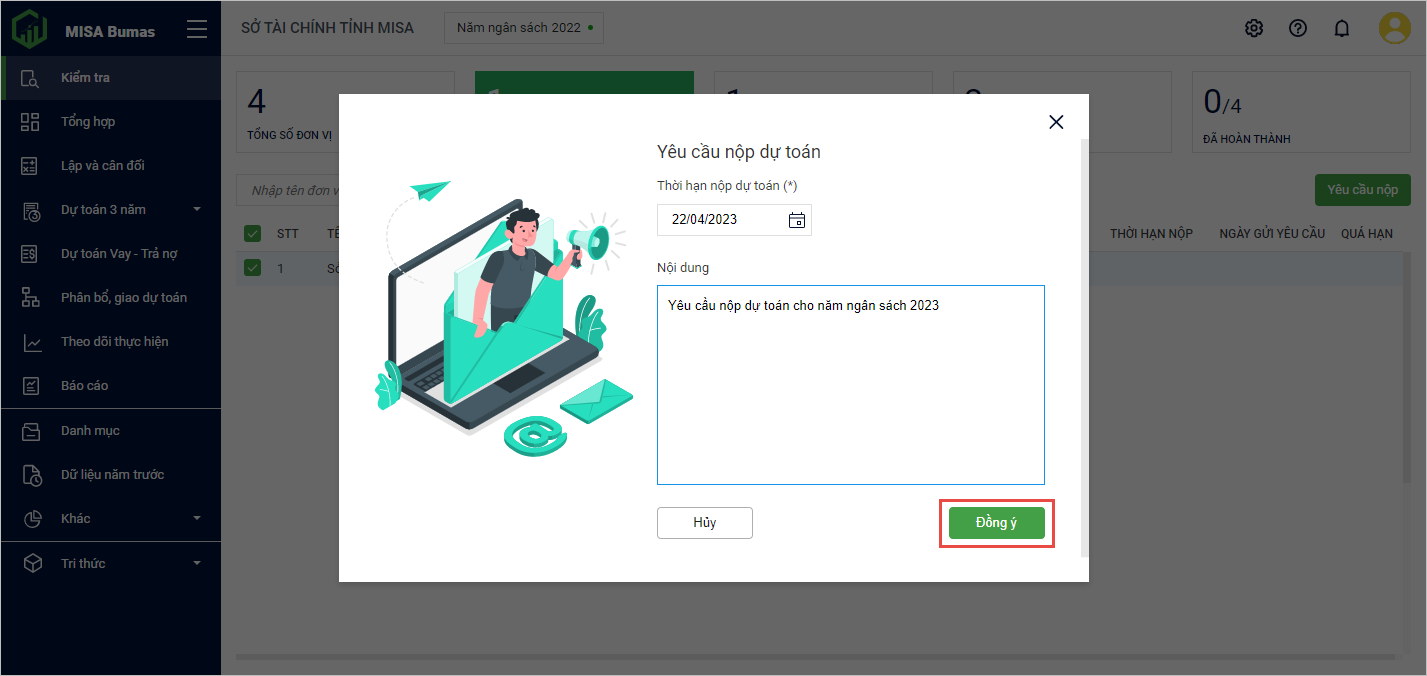 - Chọn Thời hạn nộp dự toán, Nội dung.