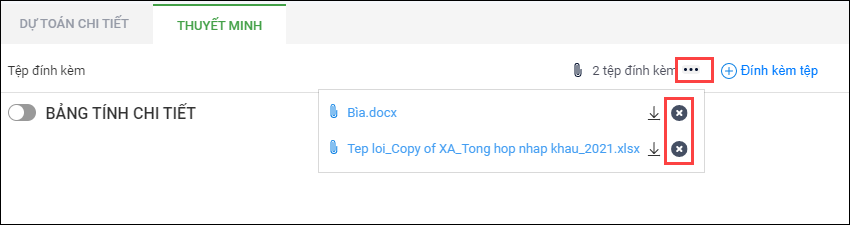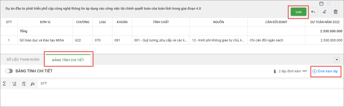 - Để thuyết minh số liệu cho nội dung chi anh/chị chọn Bảng tính chi tiết, chọn Đính kèm tệp, chọn tệp đính kèm, sau đó nhấn vào Lưu.