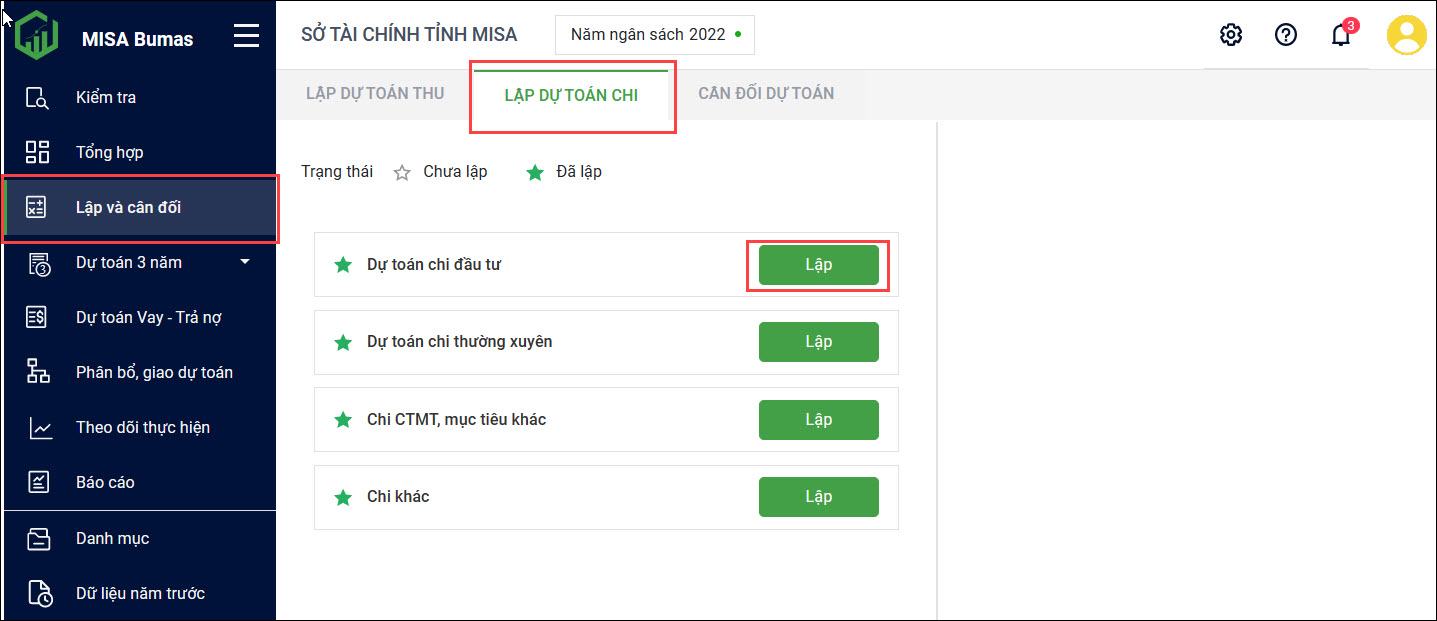 2. Nhấn Lập tại phần Dự toán chi đầu tư.