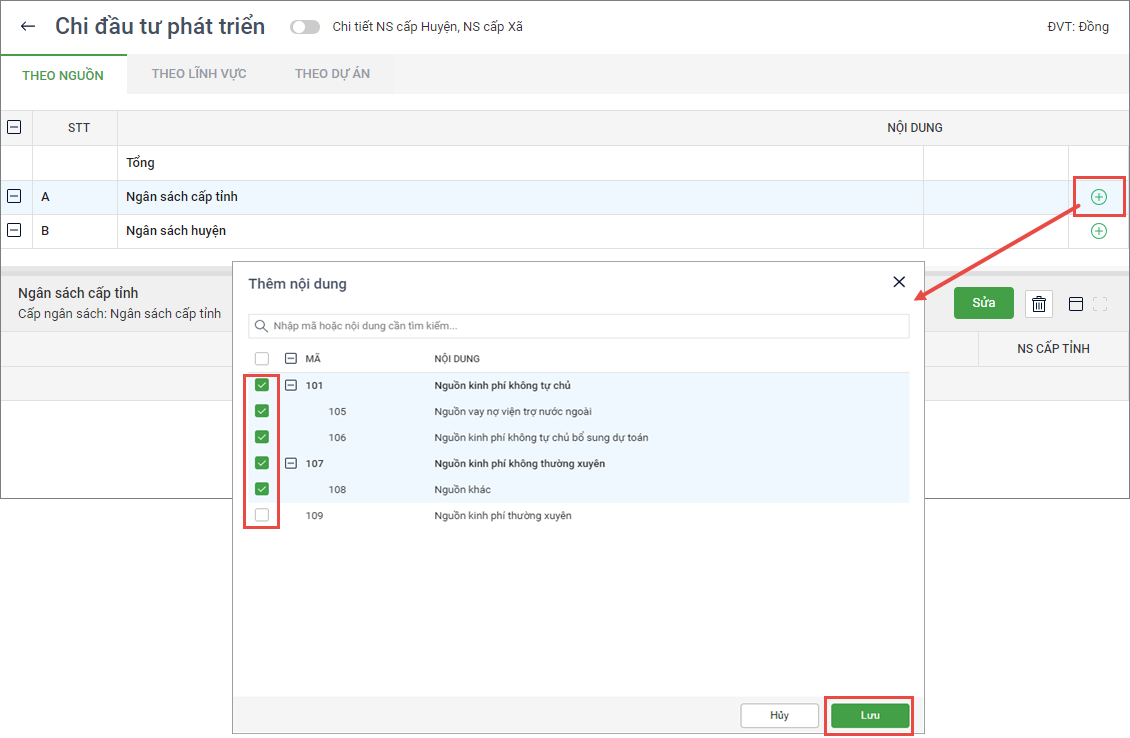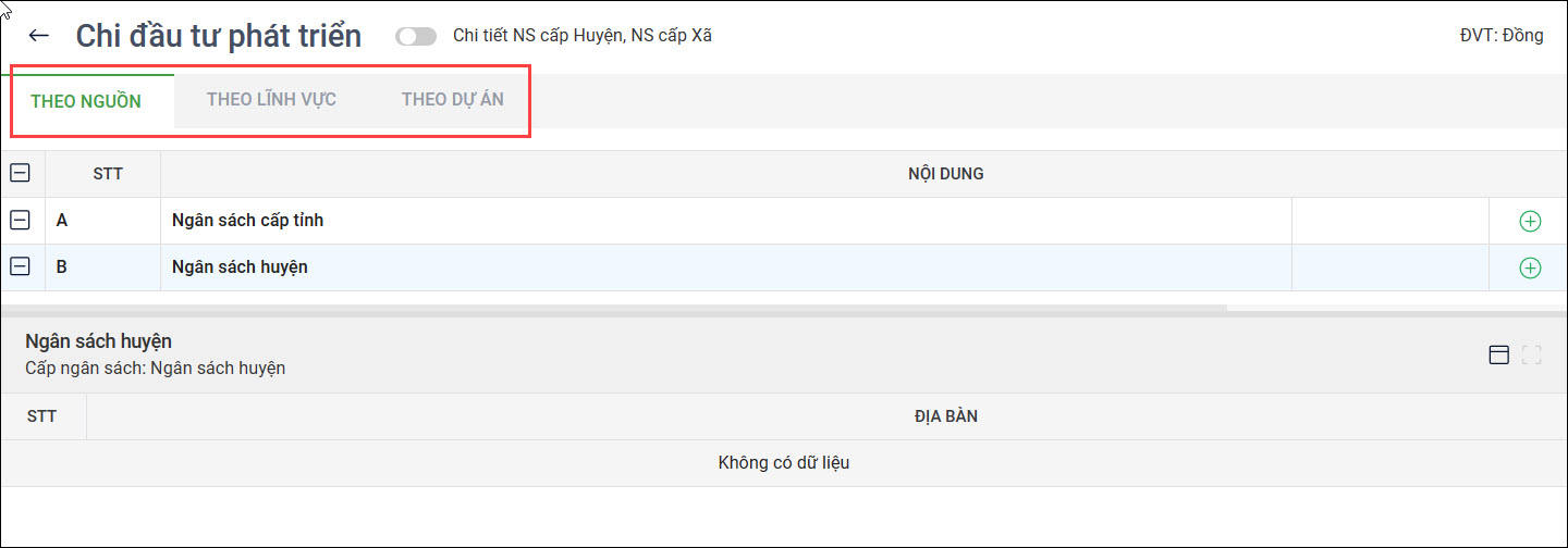 - Tại tab Theo nguồn, nhấn vào biểu tượng dấu cộng tại cấp ngân sách để thêm nội dung Chi đầu tư.