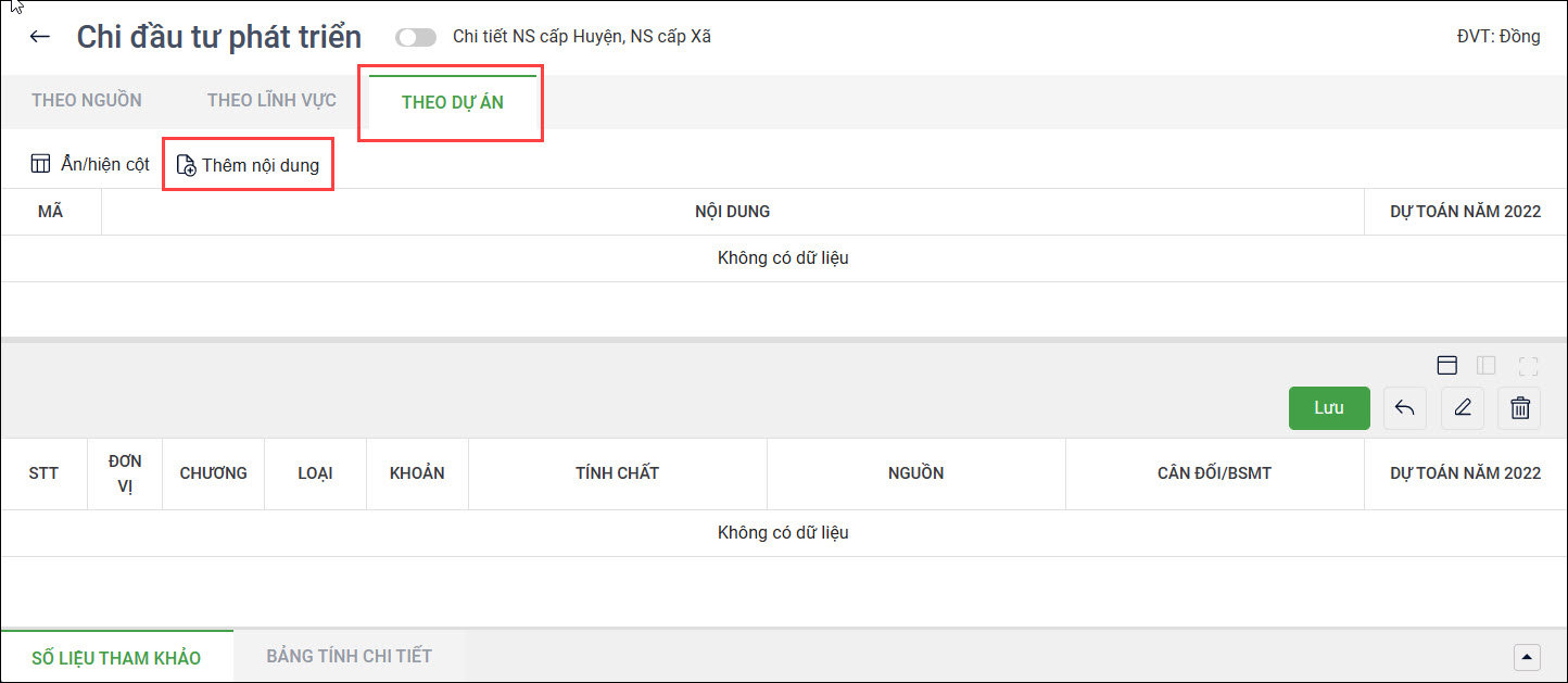 Trong trường hợp thiếu danh mục Dự án đầu tư phát triển, đơn vị cần thêm mới danh mục Dự án đầu tư phát triển, xem hướng dẫn chi tiết tại đây.