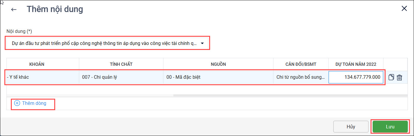 - Nếu anh/chị muốn lập dự toán nội dung chi này cho các đơn vị cấp dưới khác có thể nhấn Thêm dòng hoặc Nhân bản.