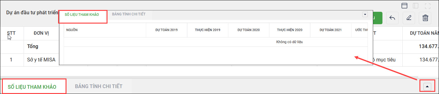 - Để có căn cứ lập dự toán cho từng nhiệm vụ chi năm kế hoạch, anh/chị có thể tham khảo số liệu năm trước tại tab Số liệu tham khảo, bằng cách chọn dấu mũi tên, chọn tab Số liệu tham khảo.