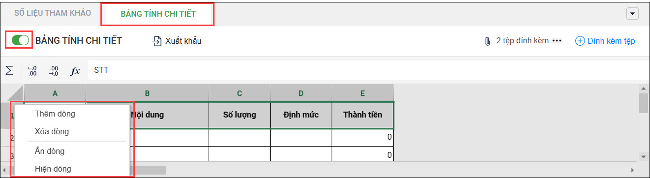 - Phần mềm sẽ hiển thị một bảng tính excel mặc định, anh/chị nhập số liệu trực tiếp vào bảng này. Có thể nhấn chuột phải để thêm dòng, xóa dòng, ẩn/hiện dòng, sửa công thức cột thành tiền nếu muốn.