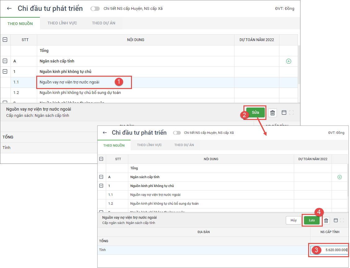 - Chọn nguồn cần lập dự toán, nhấn Sửa.