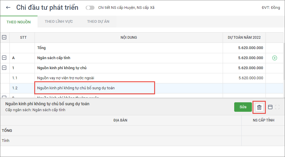 4. Xóa nội dung Chi đầu tư: Chọn nội dung chi, sau đó nhấn vào biểu tượng thùng rác để xóa.