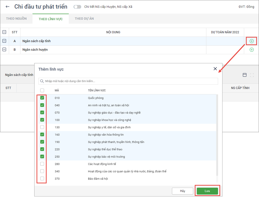 - Tích chọn lĩnh vực cần lập dự toán, nhấn Lưu.