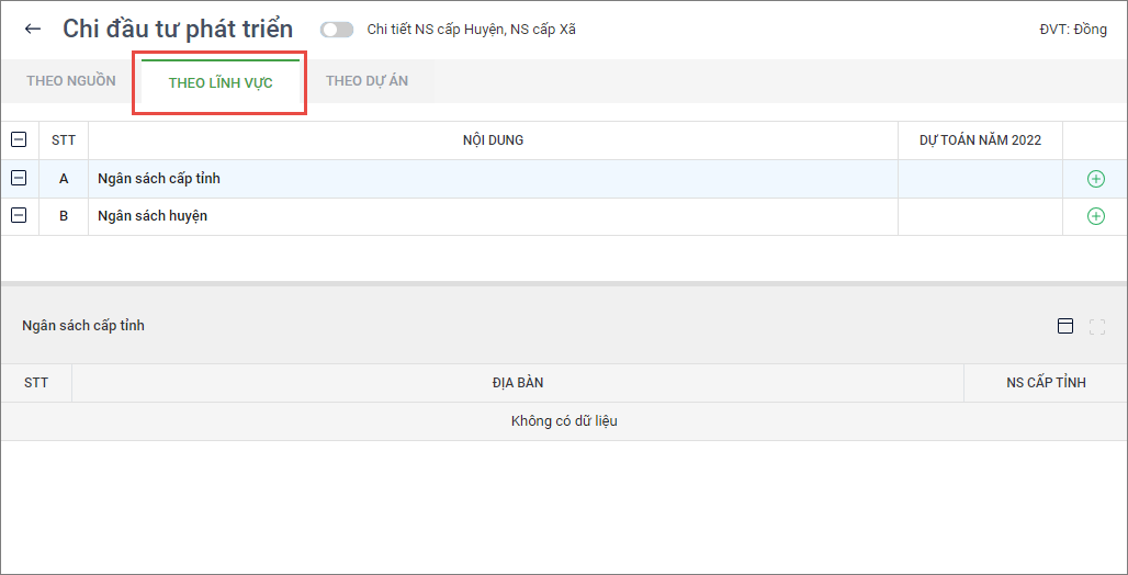 1. Chọn tab Theo lĩnh vực để lập dự toán theo lĩnh vực.