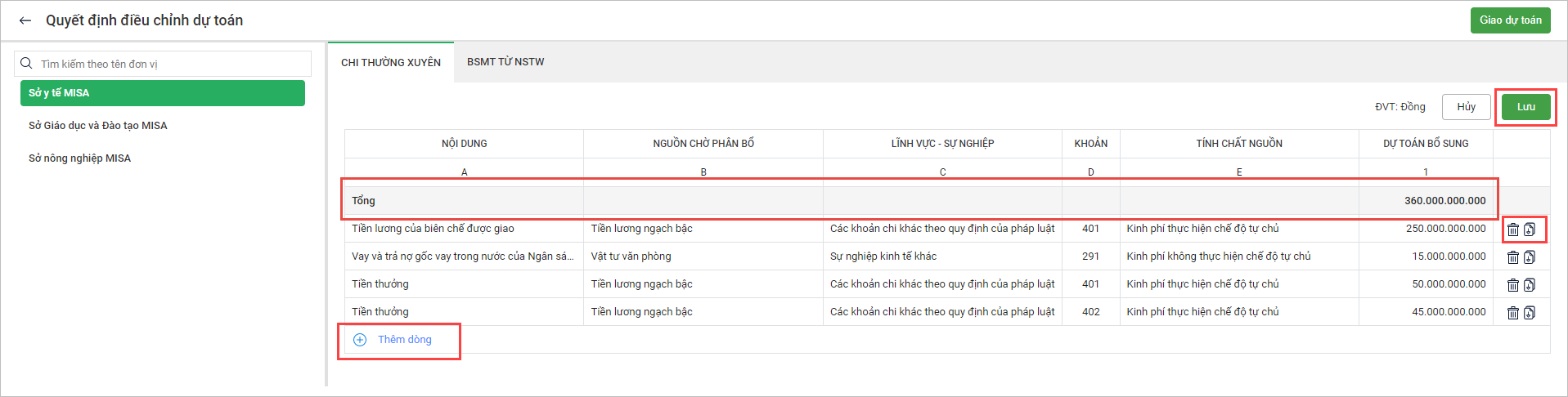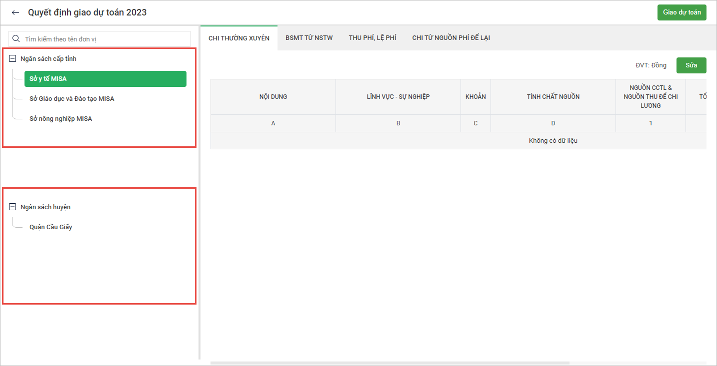 Ví dụ: Tại Sở y tế Misa chọn Giao dự toán lúc này toàn bộ dự toán của cấp tỉnh sẽ được giao xuống cho đơn vị cấp dưới.