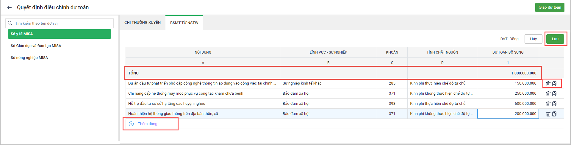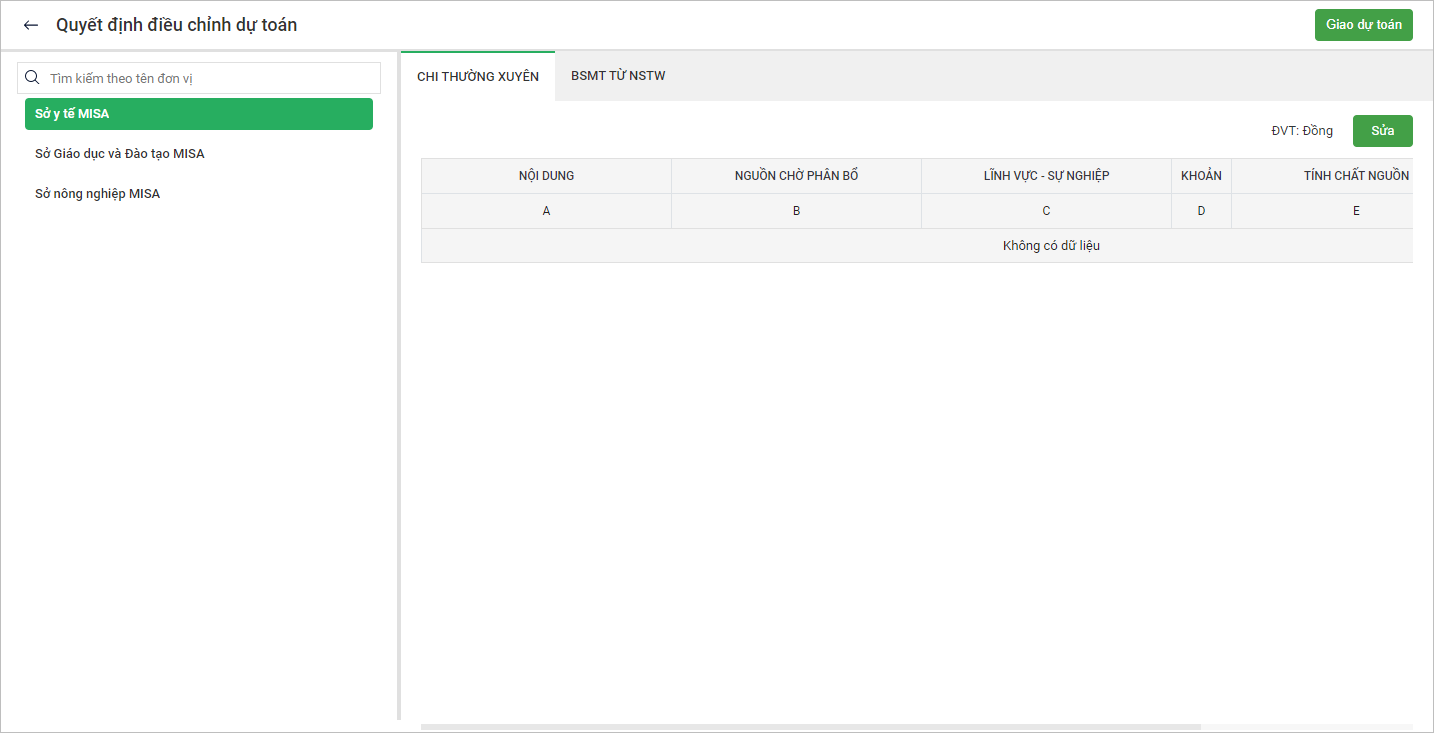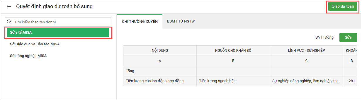 • Chọn đơn vị cần bổ sung dự toán. Ví dụ: Sở y tế MISA.