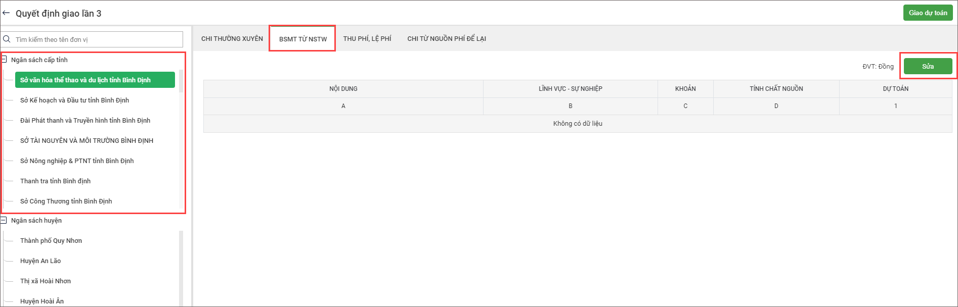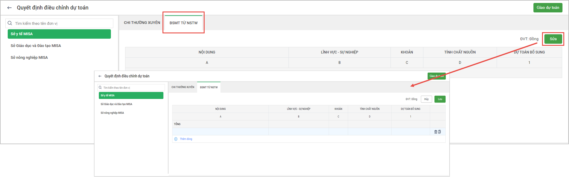 • Chọn tab BSMT từ NSTW. Nhấn Sửa.