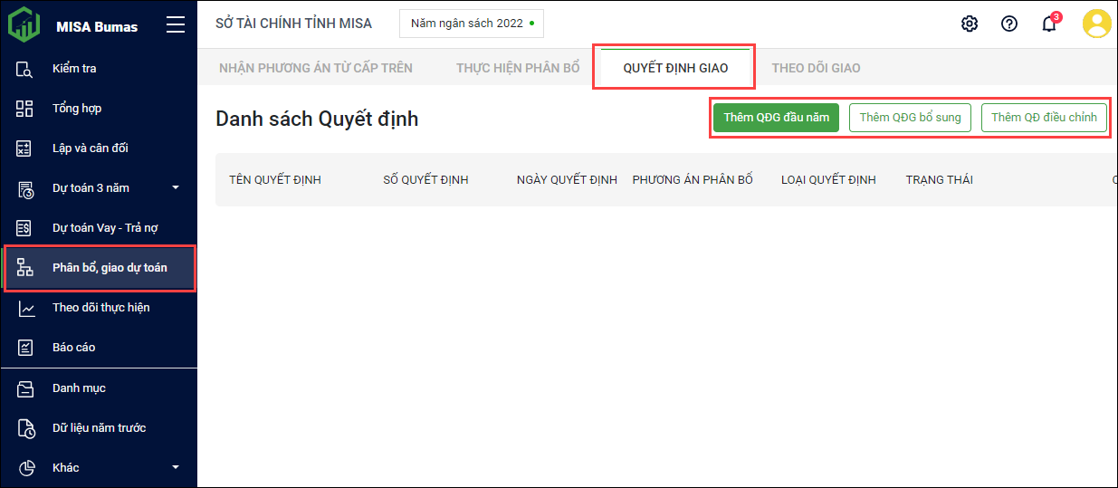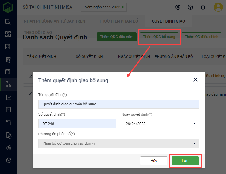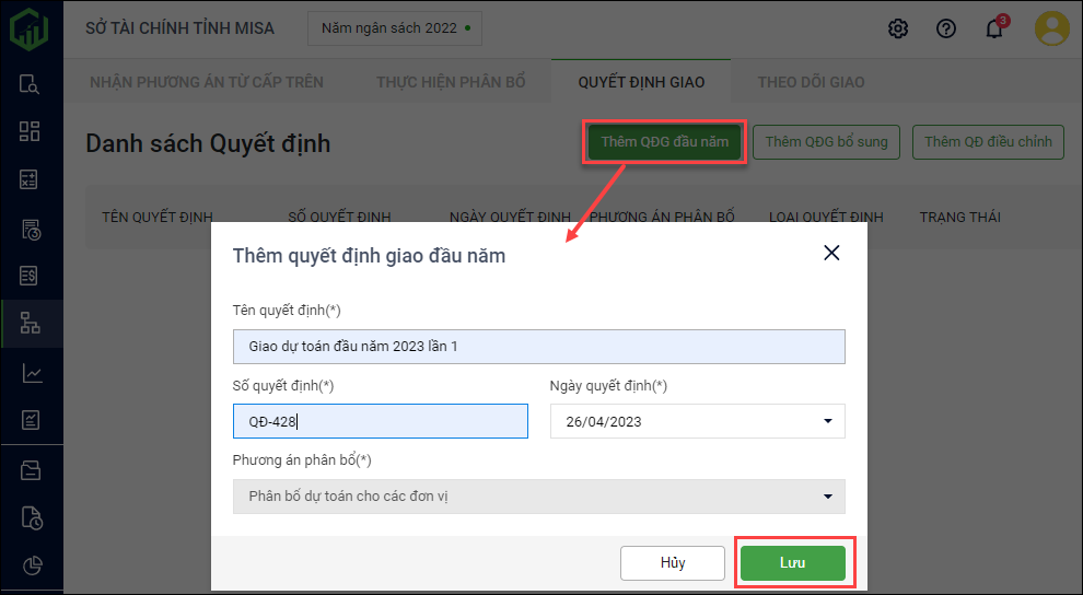 2. Nhập Tên quyết định giao, Số quyết định, chọn Ngày quyết định, Phương án phân bổ, nhấn Lưu.