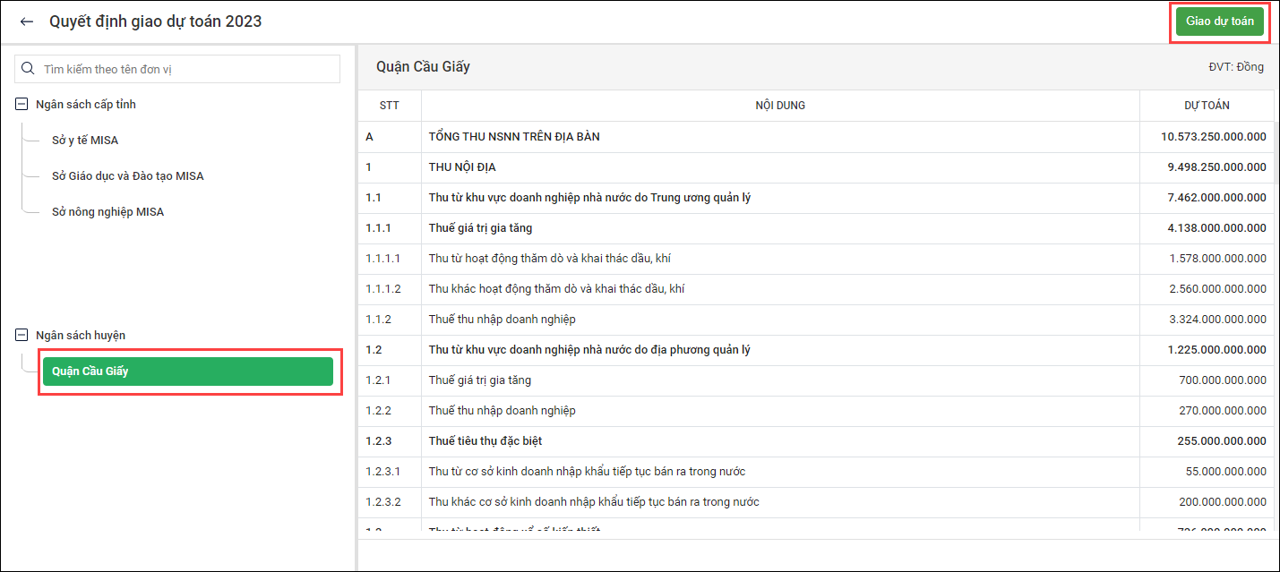 Ví dụ: Tại Quận Cầu giấy chọn Giao dự toán lúc này toàn bộ dự toán của cấp tỉnh và cấp Huyện sẽ được giao xuống cho đơn vị cấp dưới.